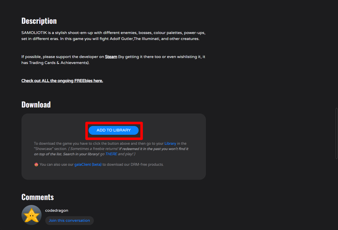 "SAMOLIOTIK" 게임 페이지를 내려 [ADD TO LIBRARY]를 클릭합니다.