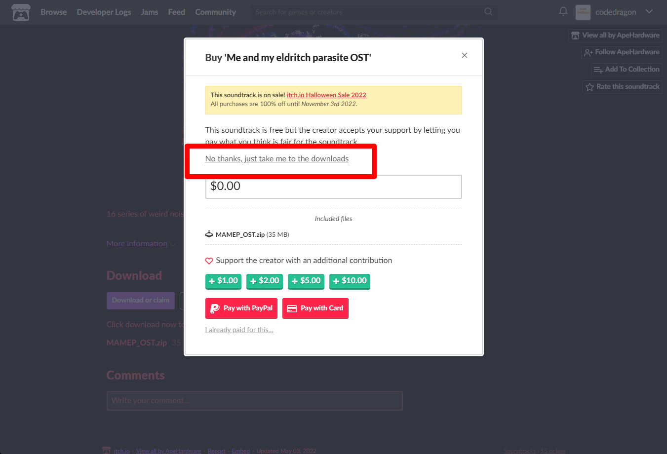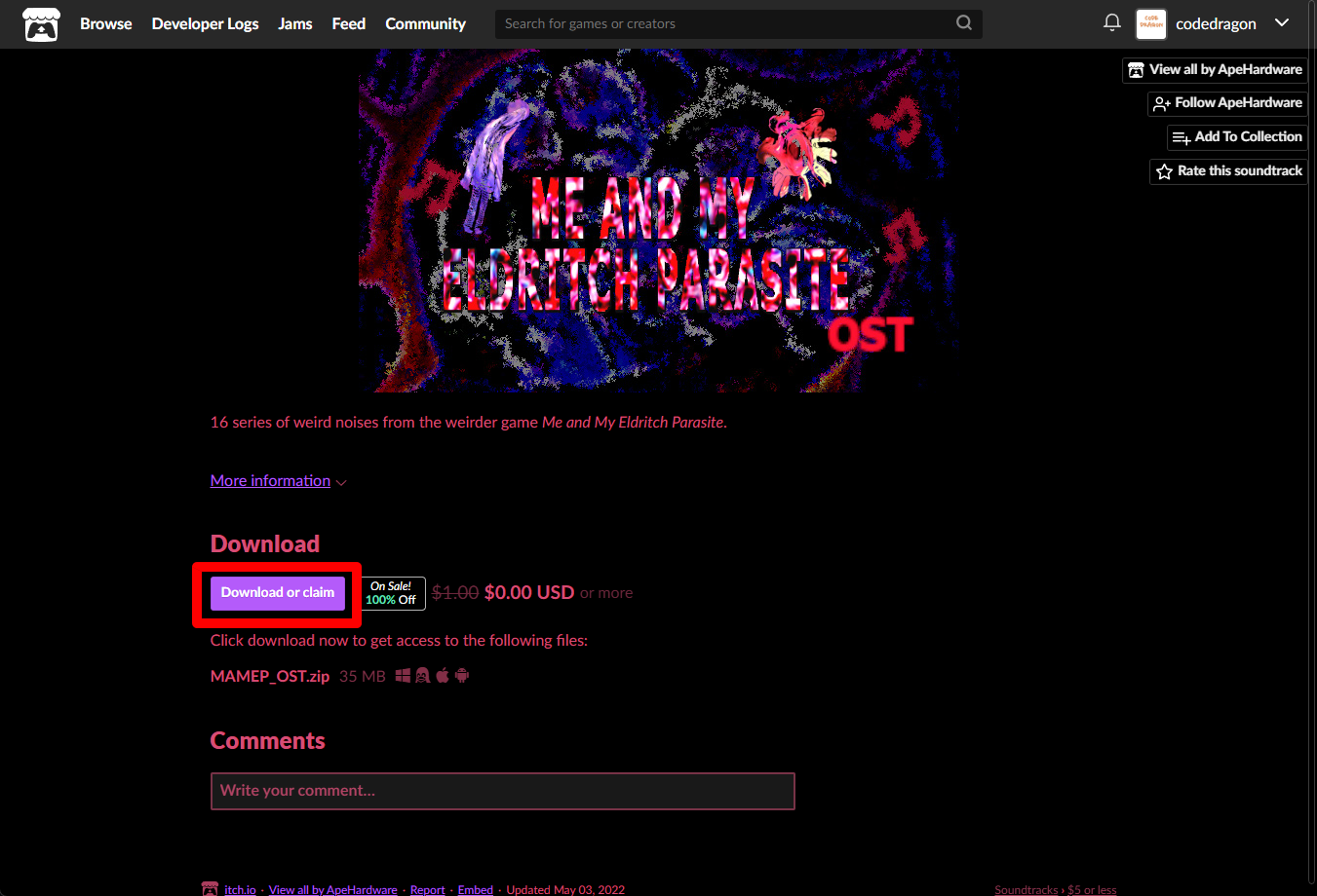 "Me and my eldritch parasite OST" 페이지에 있는 [Download or claim]을 클릭합니다.