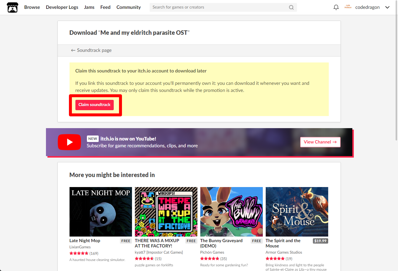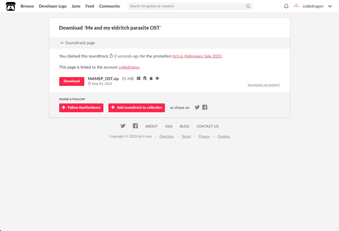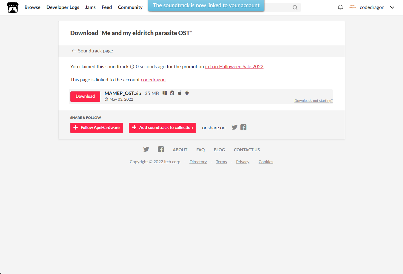 [Claim soundtrack]을 클릭하면 "Me and my eldritch parasite OST" 게임이 나의 게임 라이브러리에 추가되고 설치파일을 다운받을 수 있는 페이지로 이동됩니다.