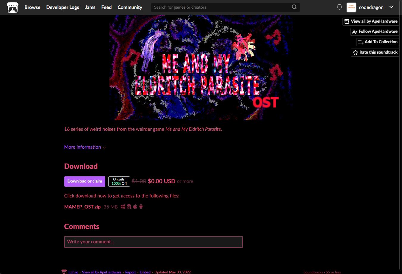 [Claim soundtrack]을 클릭하면 "Me and my eldritch parasite OST" 게임이 나의 게임 라이브러리에 추가되고 설치파일을 다운받을 수 있는 페이지로 이동됩니다.
