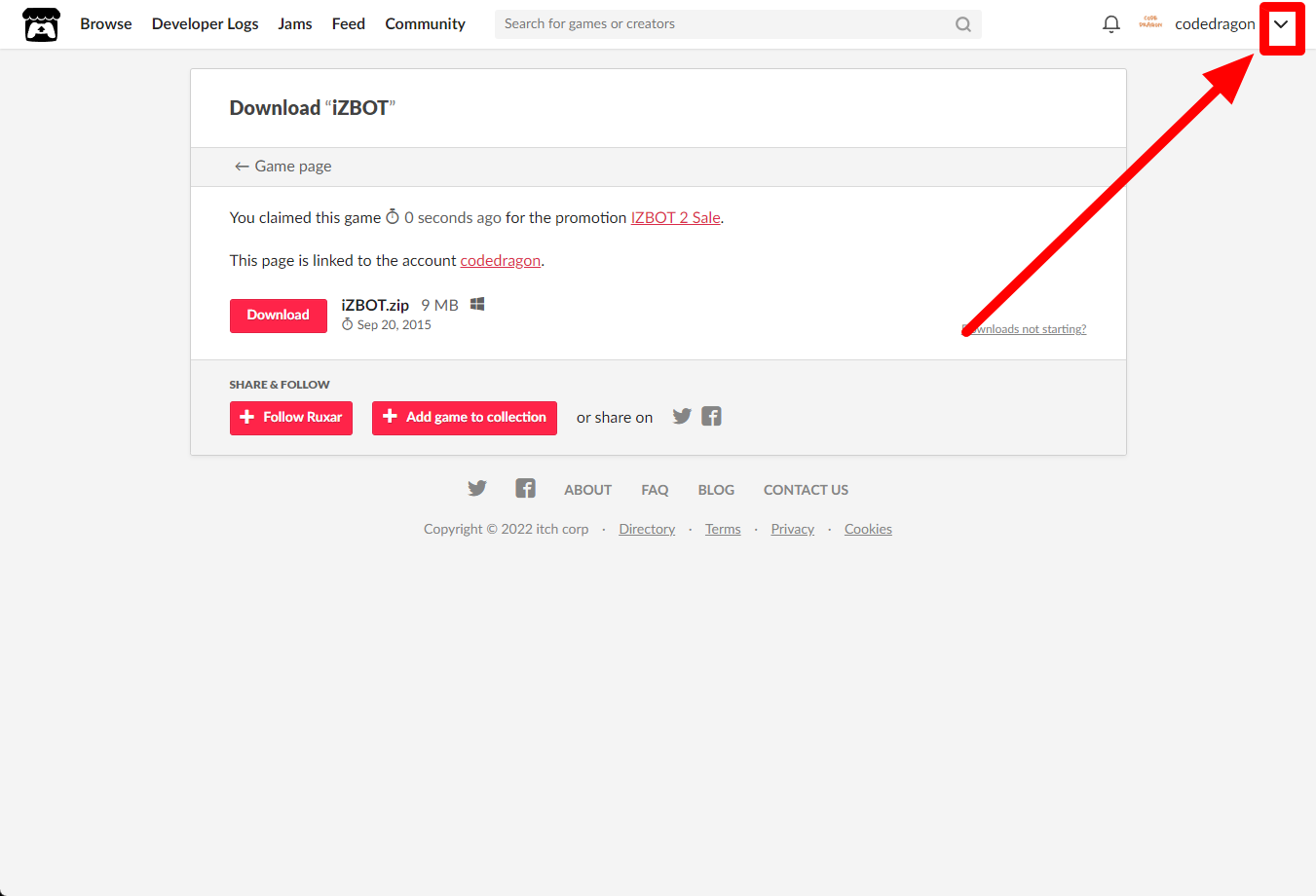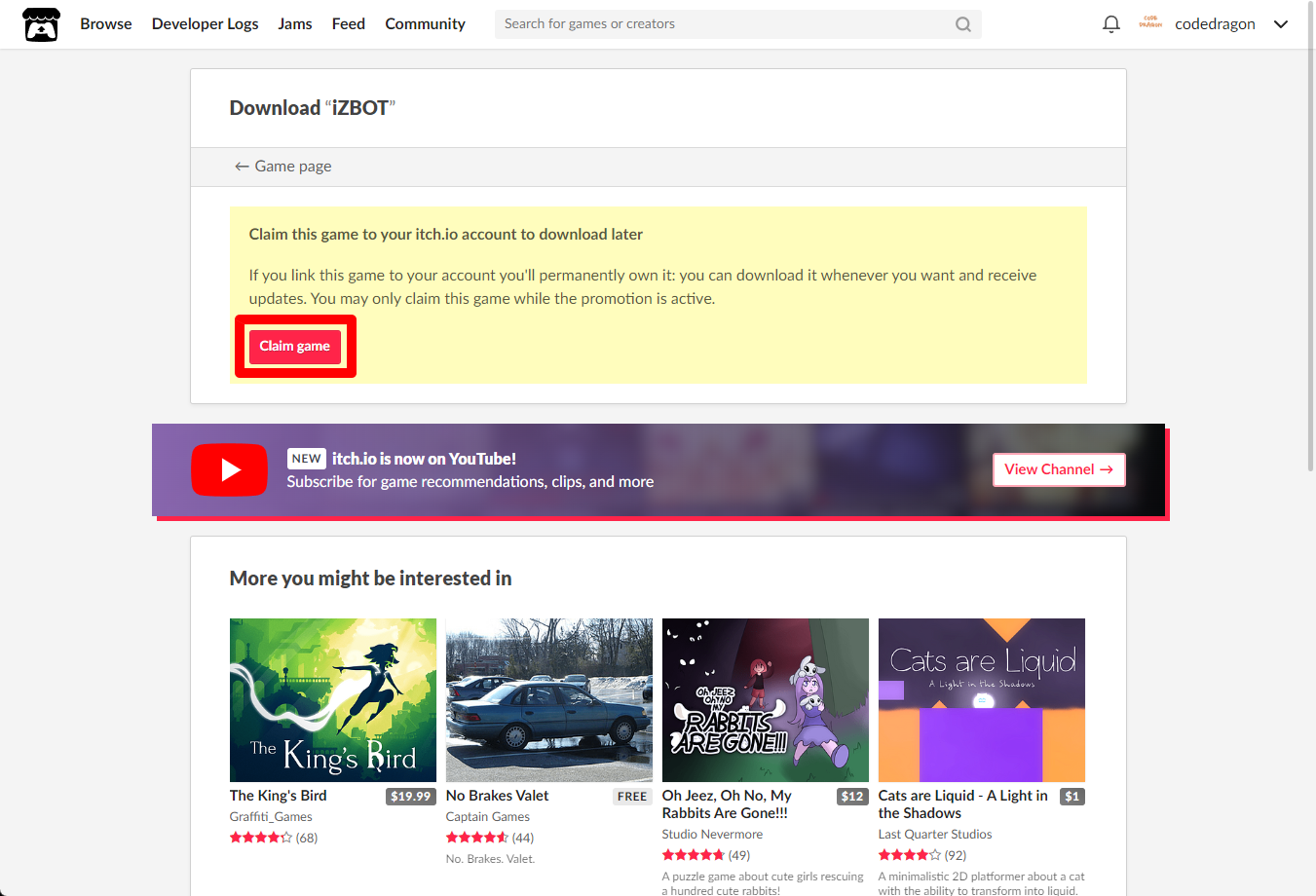 [Claim game]을 클릭하면 "iZBOT" 게임이 나의 게임 라이브러리에 추가되고 설치파일을 다운받을 수 있는 페이지로 이동됩니다.