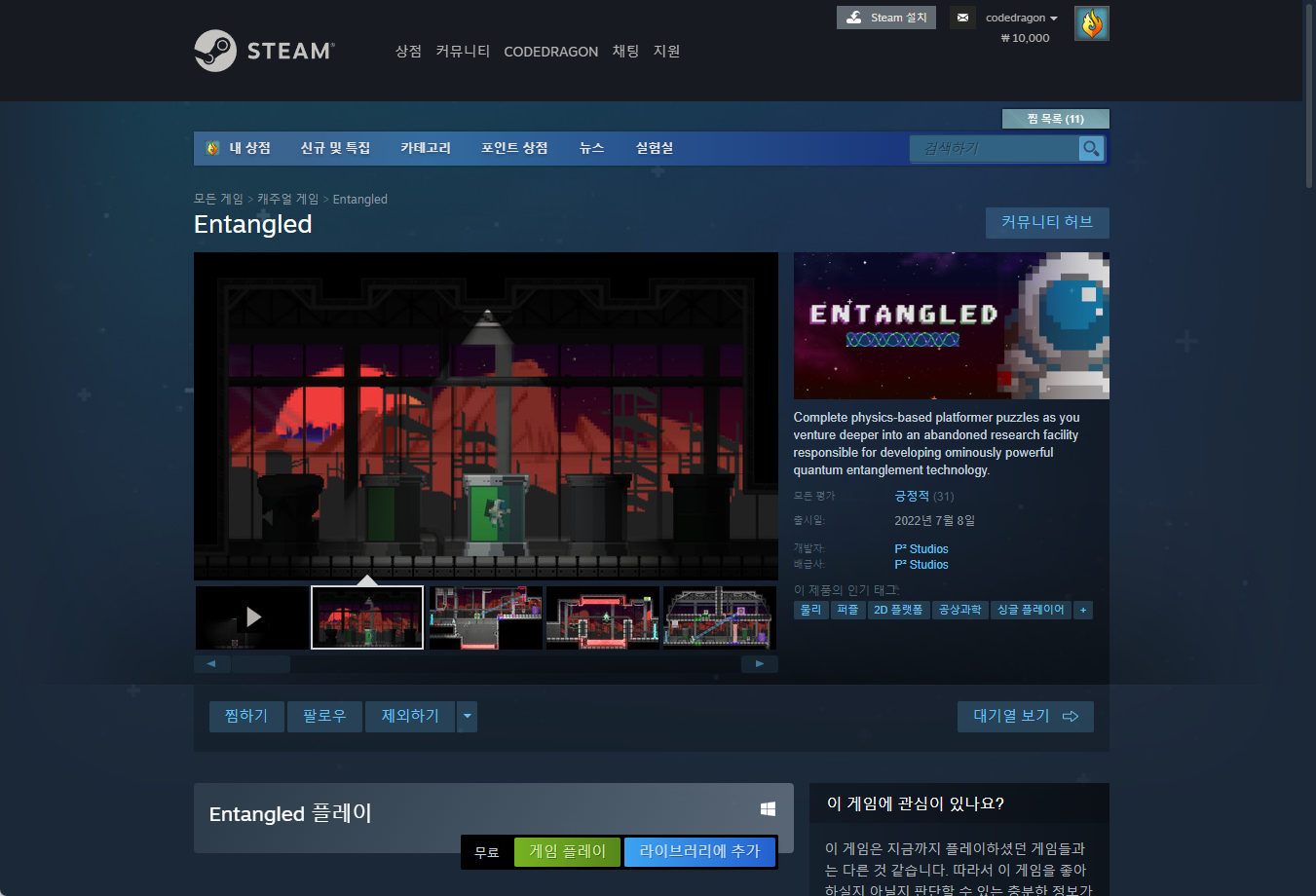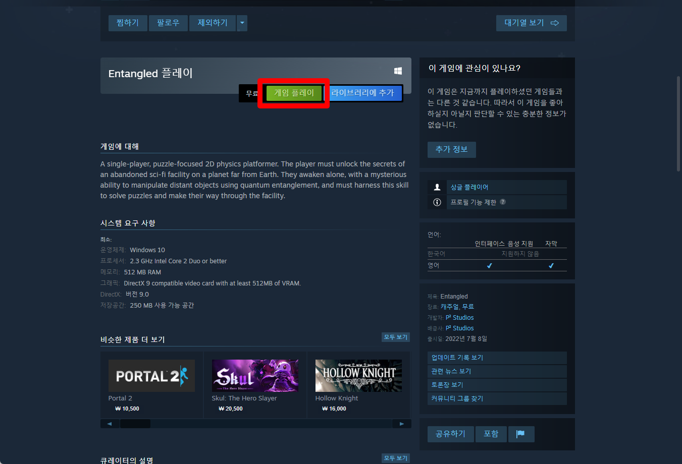 "Entangled" 페이지를 내려 [게임 플레이]를 클릭하면 됩니다.
