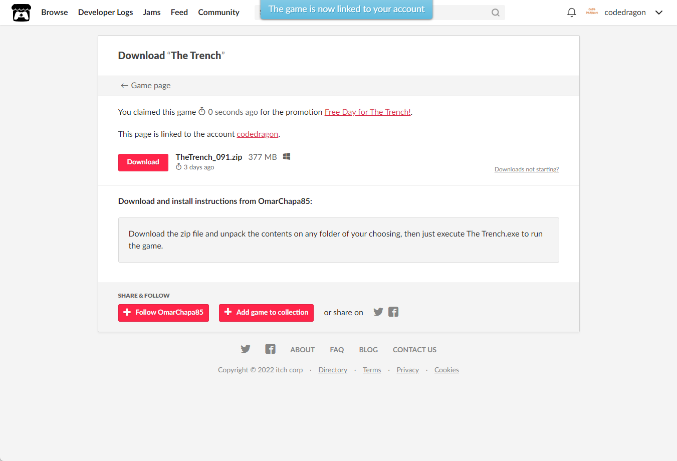 [Claim game]을 클릭하면 "The Trench" 게임이 나의 게임 라이브러리에 추가되고 설치파일을 다운받을 수 있는 페이지로 이동됩니다.