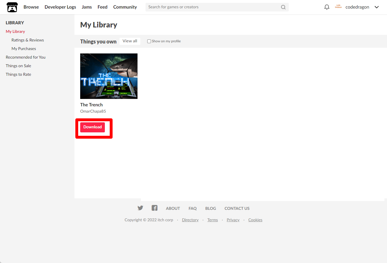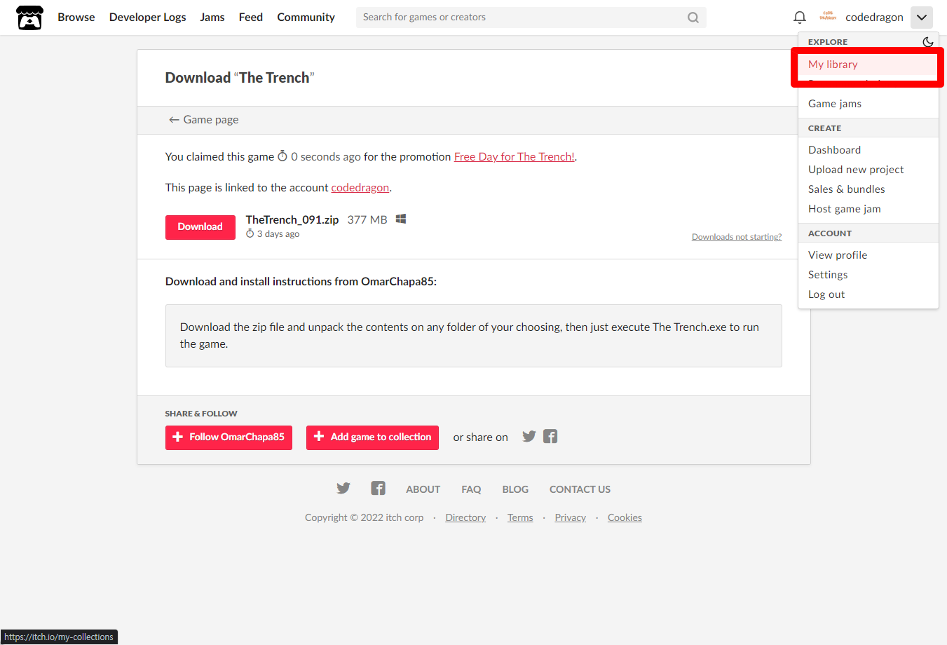 [Claim game]을 클릭하면 "The Trench" 게임이 나의 게임 라이브러리에 추가되고 설치파일을 다운받을 수 있는 페이지로 이동됩니다.