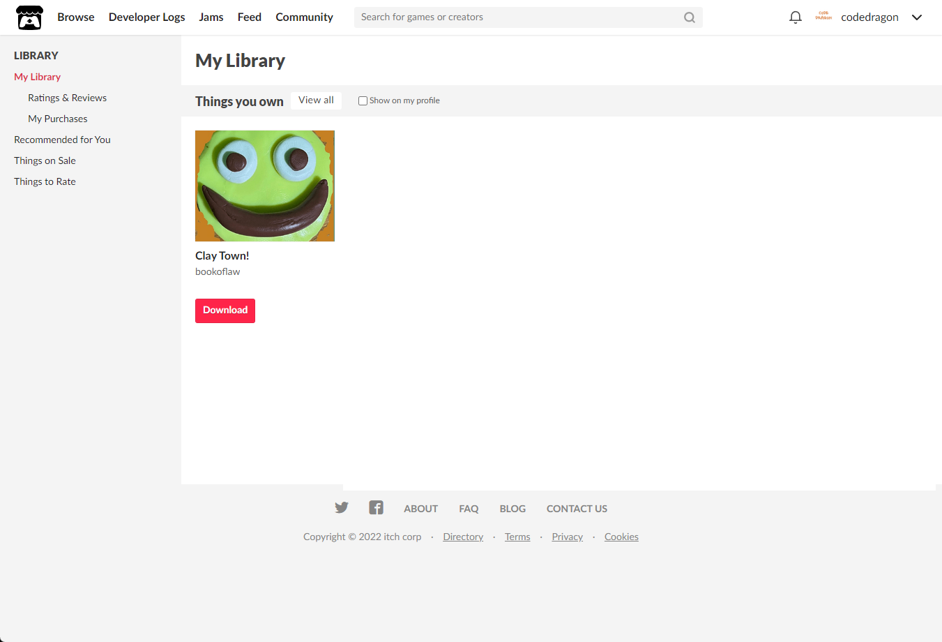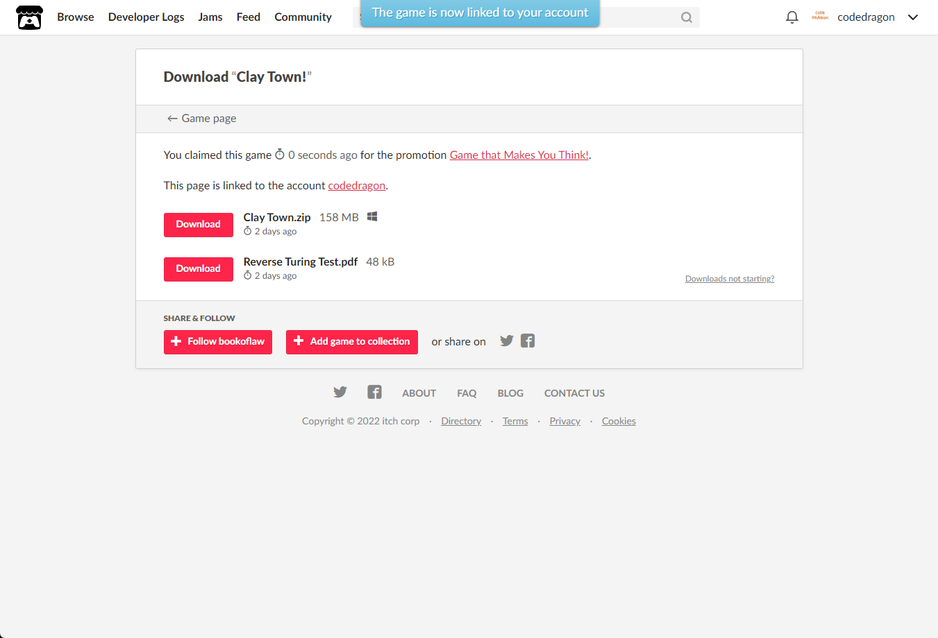 [Claim game]을 클릭하면 "Clay Town!" 게임이 나의 게임 라이브러리에 추가되고 설치파일을 다운받을 수 있는 페이지로 이동됩니다.