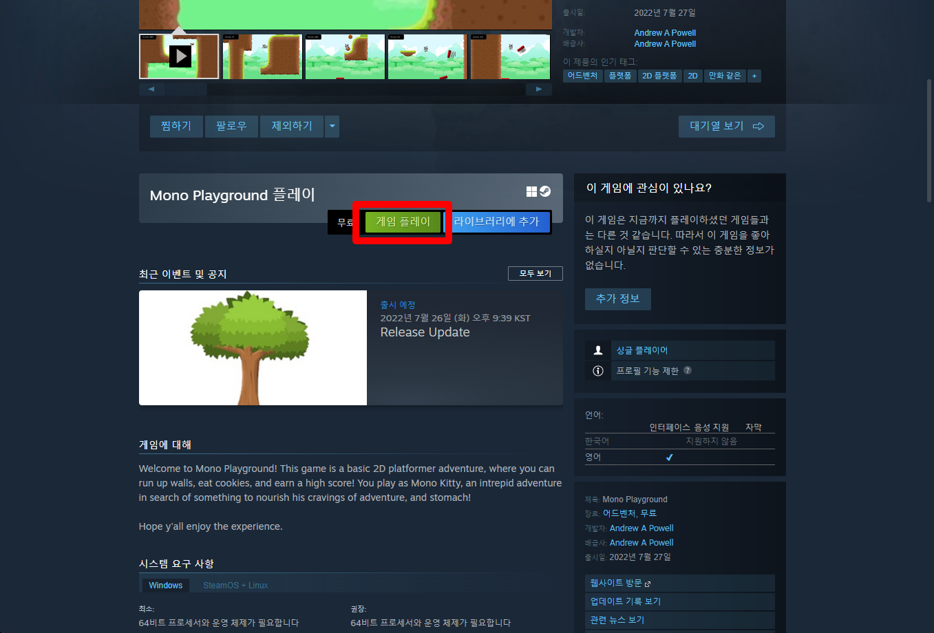 "Mono Playground" 스팀 페이지 입니다.