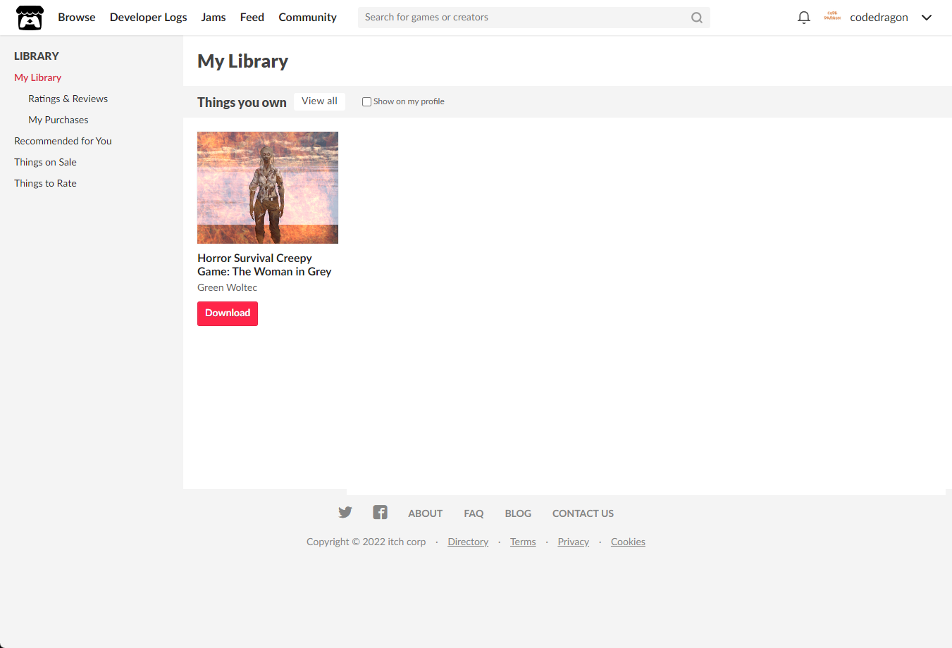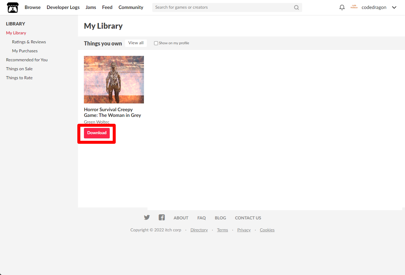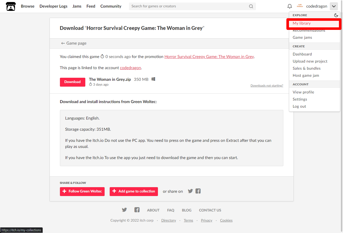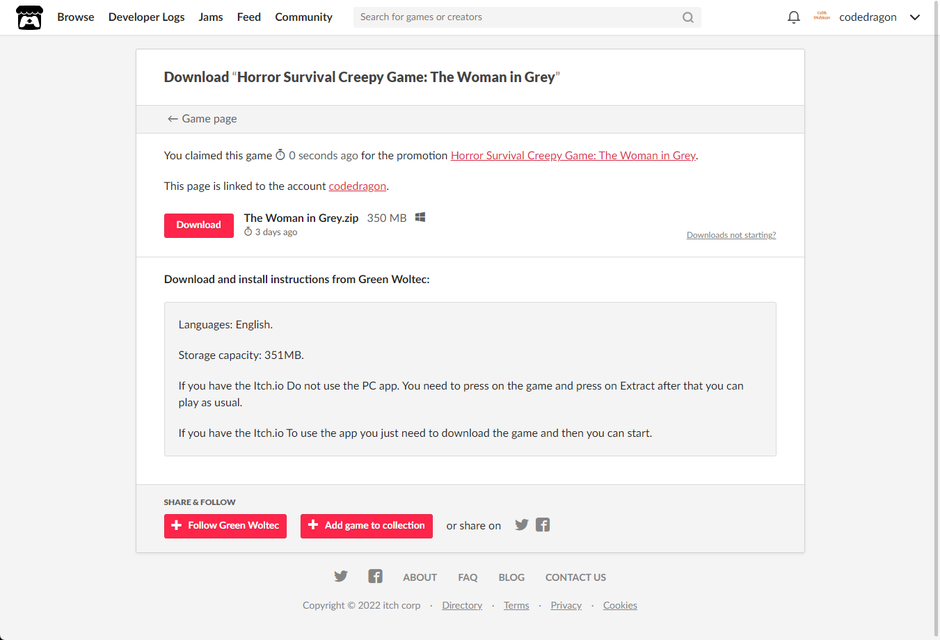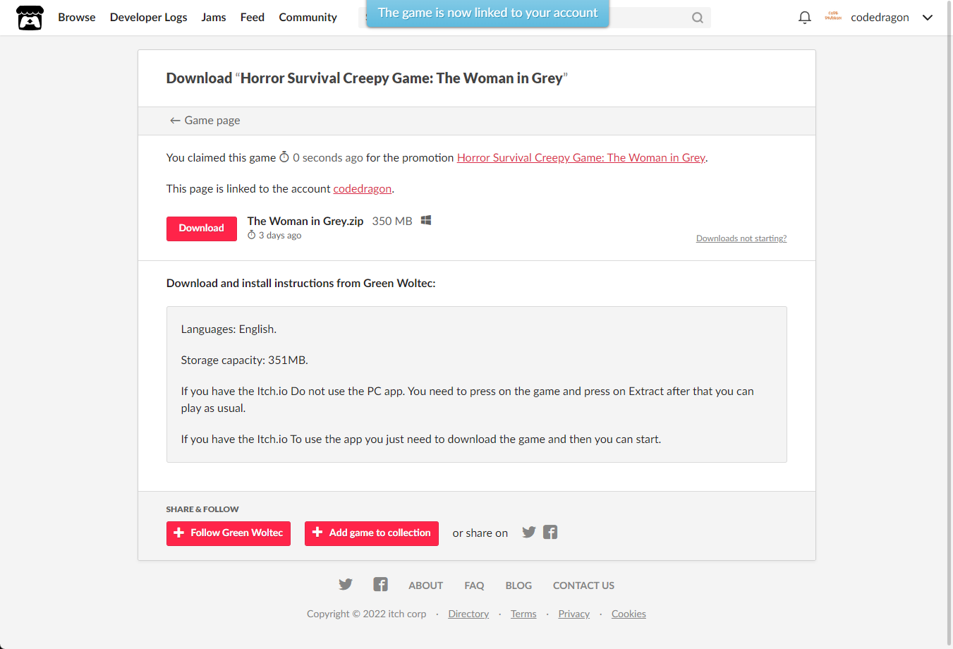 [Claim game]을 클릭하면 "Horror Survival Creepy Game: The Woman in Grey" 게임이 나의 게임 라이브러리에 추가되고 설치파일을 다운받을 수 있는 페이지로 이동됩니다.