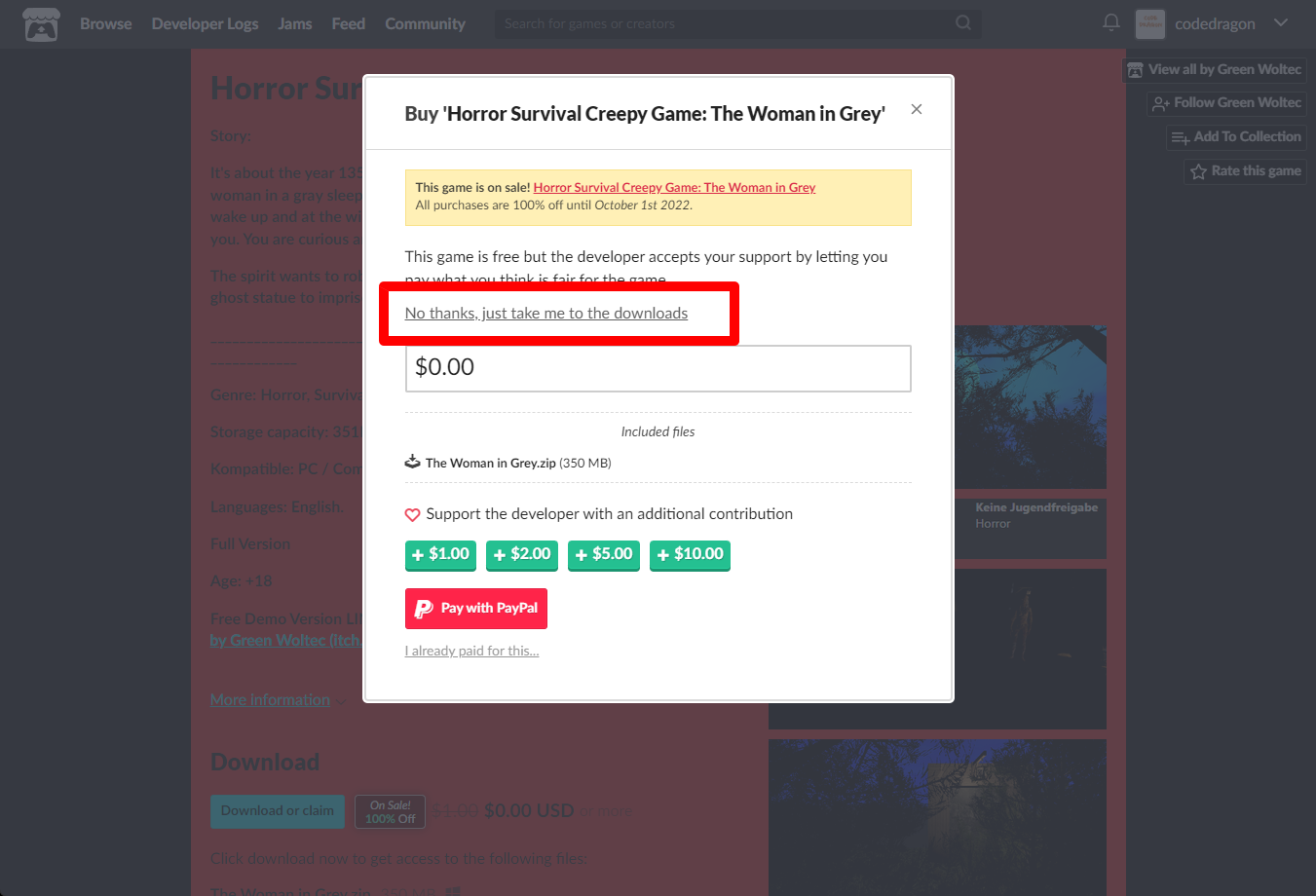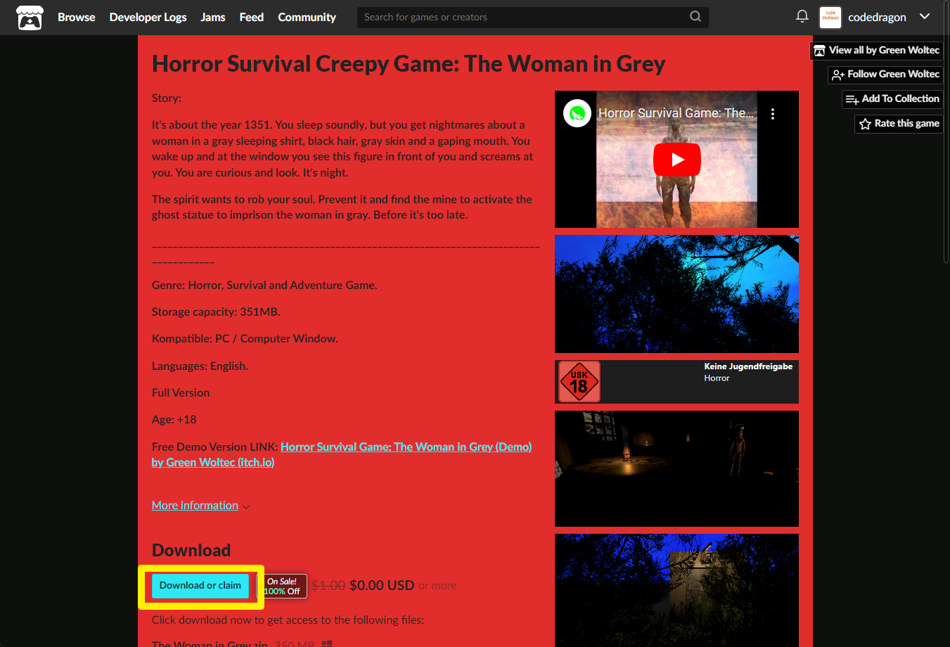 "Horror Survival Creepy Game: The Woman in Grey" 페이지에 있는 [Download or claim]을 클릭합니다.