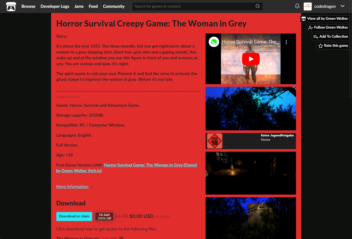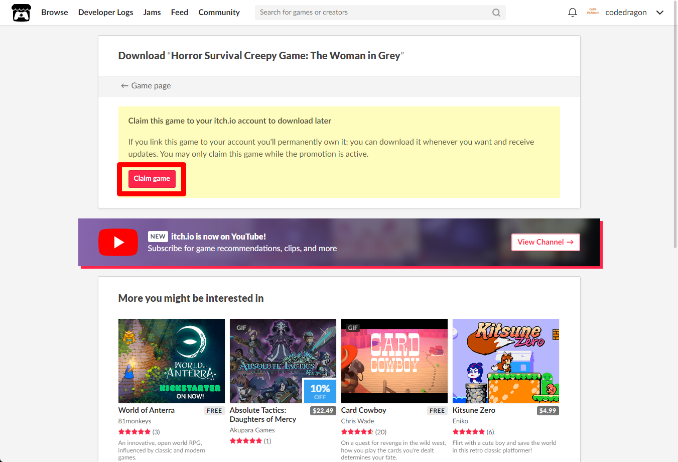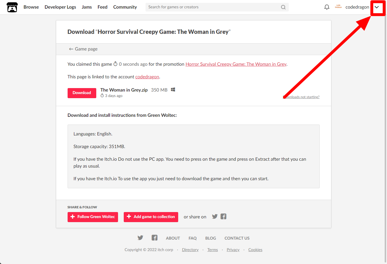 [Claim game]을 클릭하면 "Horror Survival Creepy Game: The Woman in Grey" 게임이 나의 게임 라이브러리에 추가되고 설치파일을 다운받을 수 있는 페이지로 이동됩니다.