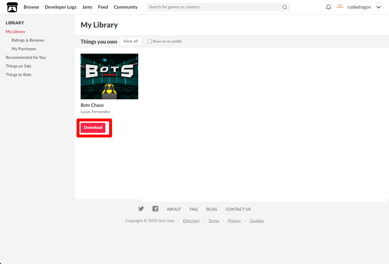 "My Lirary"에서 방금 받은 "Bots Chaos" 게임 항목을 확인할 수 있습니다.