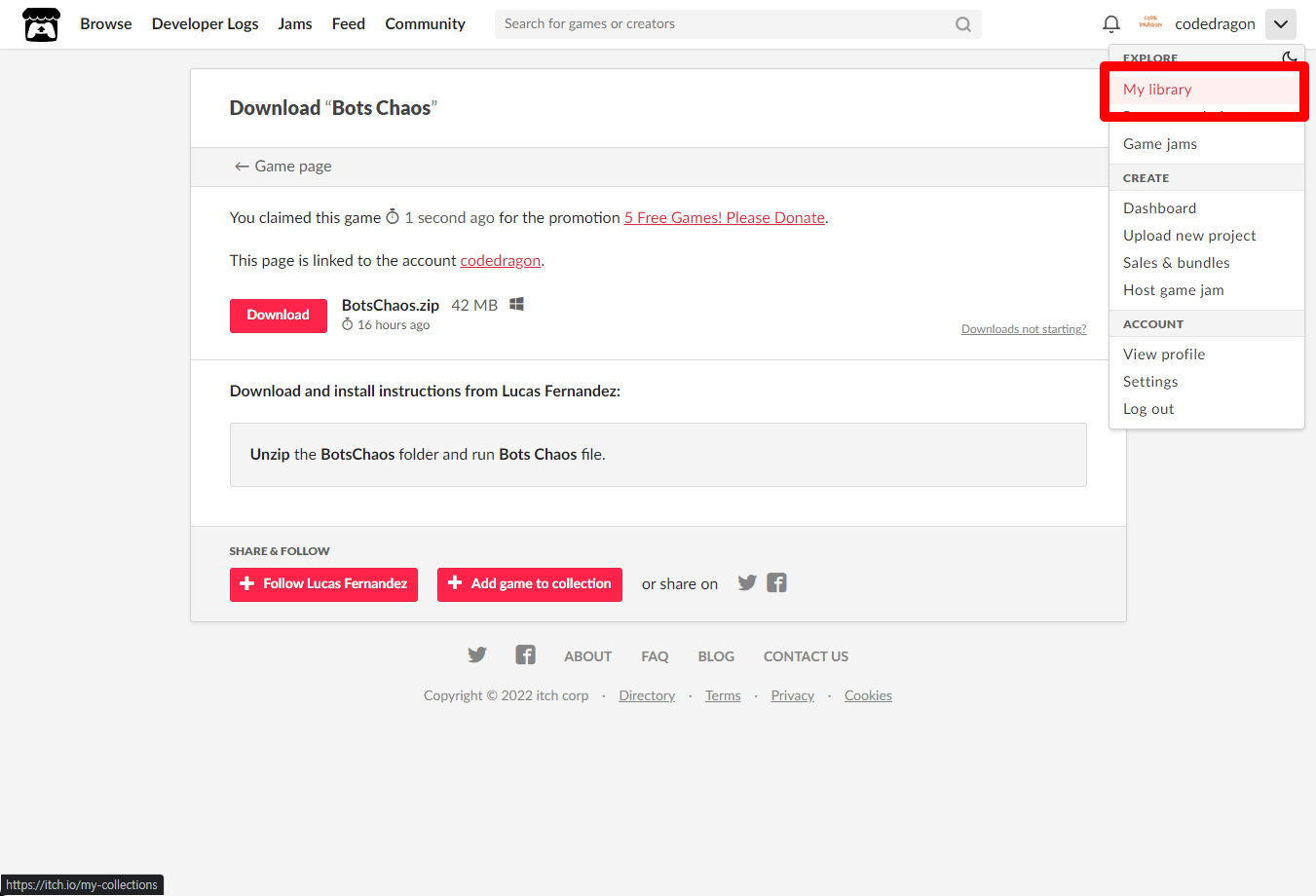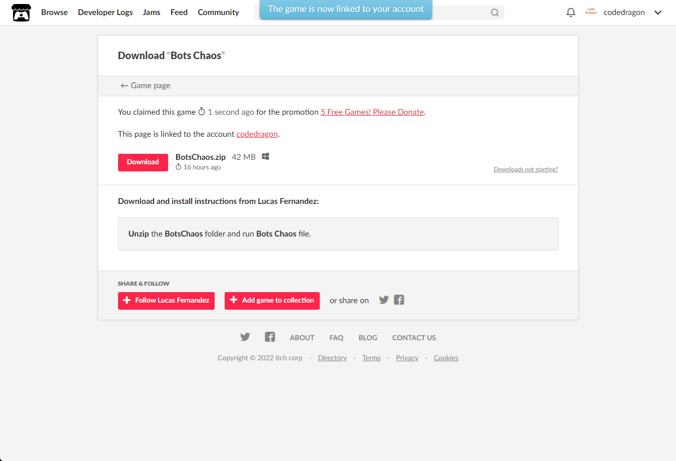 [Claim game]을 클릭하면 "Bots Chaos" 게임이 나의 게임 라이브러리에 추가되고 설치파일을 다운받을 수 있는 페이지로 이동됩니다.