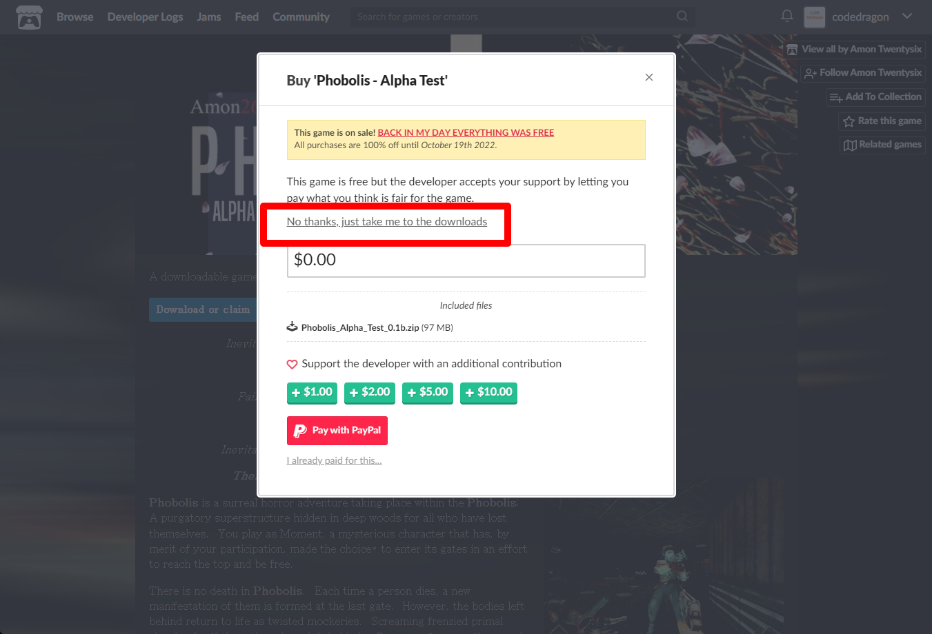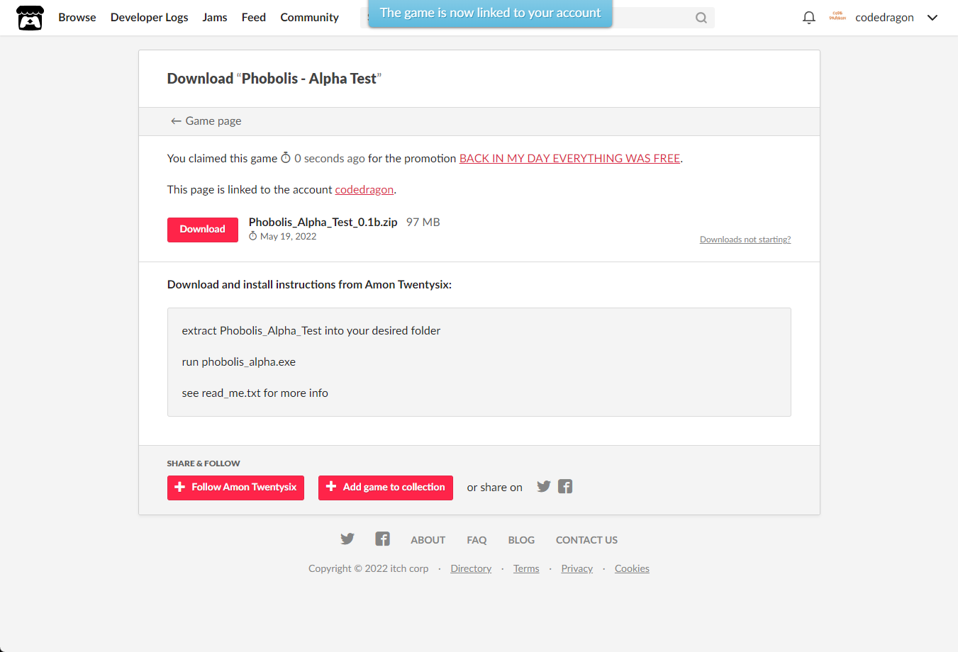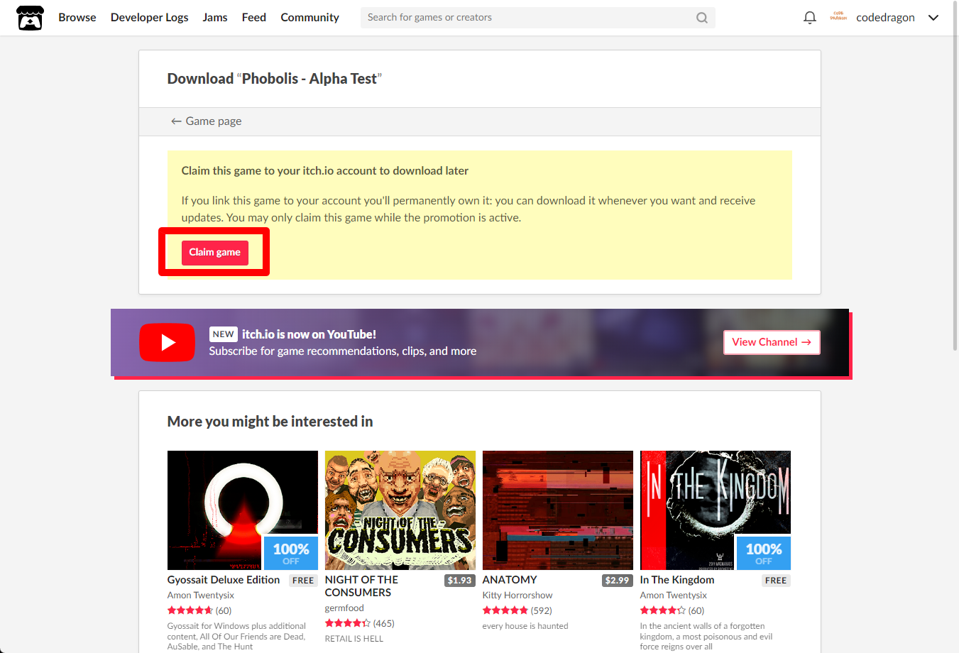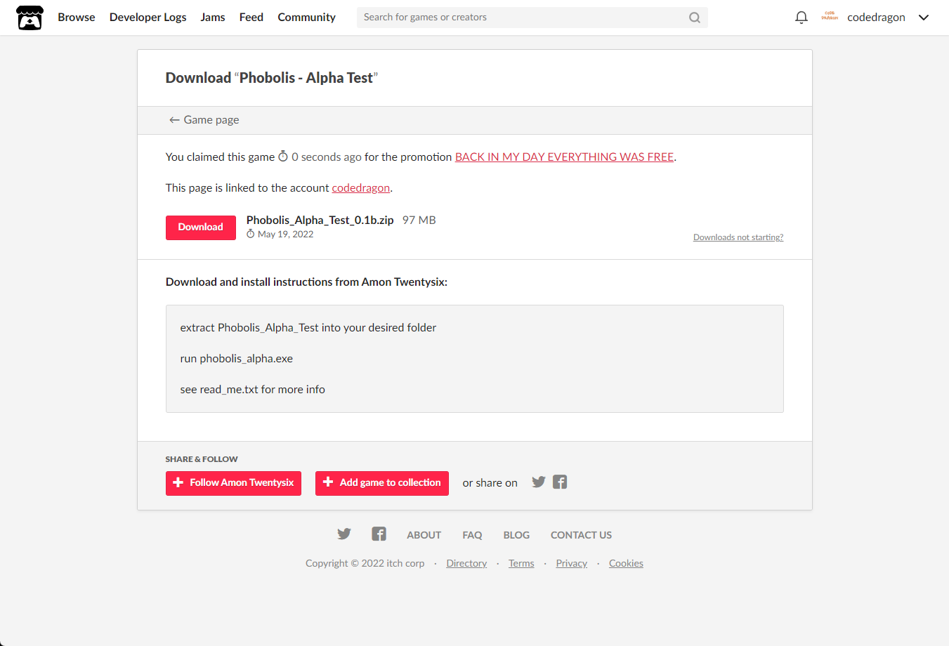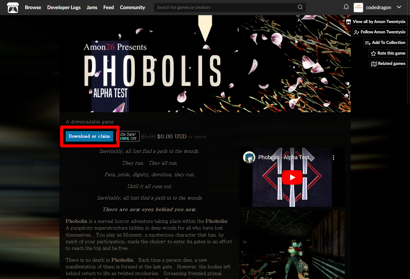 "Phobolis - Alpha Test" 페이지에 있는 [Download or claim]을 클릭합니다.