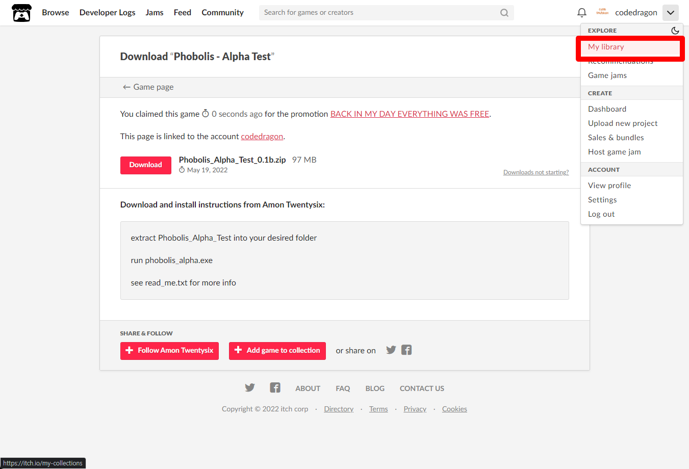 [Claim game]을 클릭하면 "Phobolis - Alpha Test" 게임이 나의 게임 라이브러리에 추가되고 설치파일을 다운받을 수 있는 페이지로 이동됩니다.