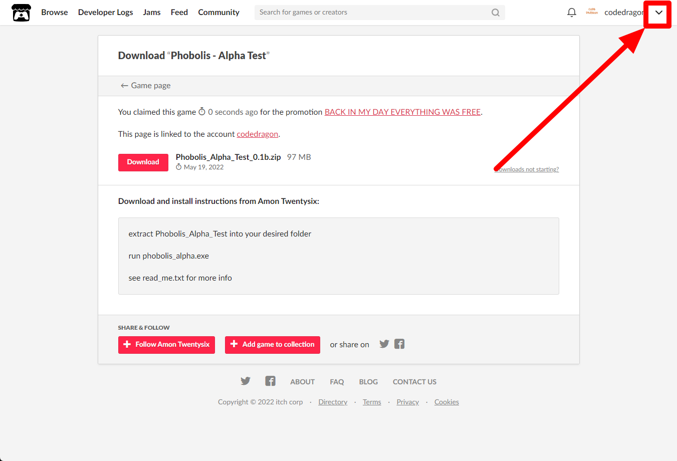 "Phobolis - Alpha Test" 페이지에 있는 [Download or claim]을 클릭합니다.