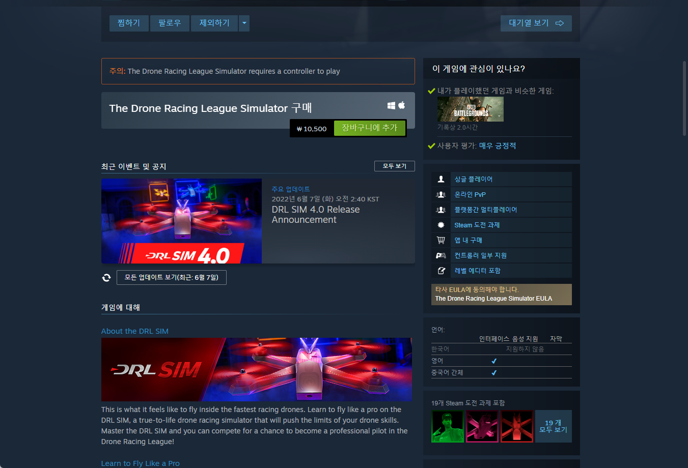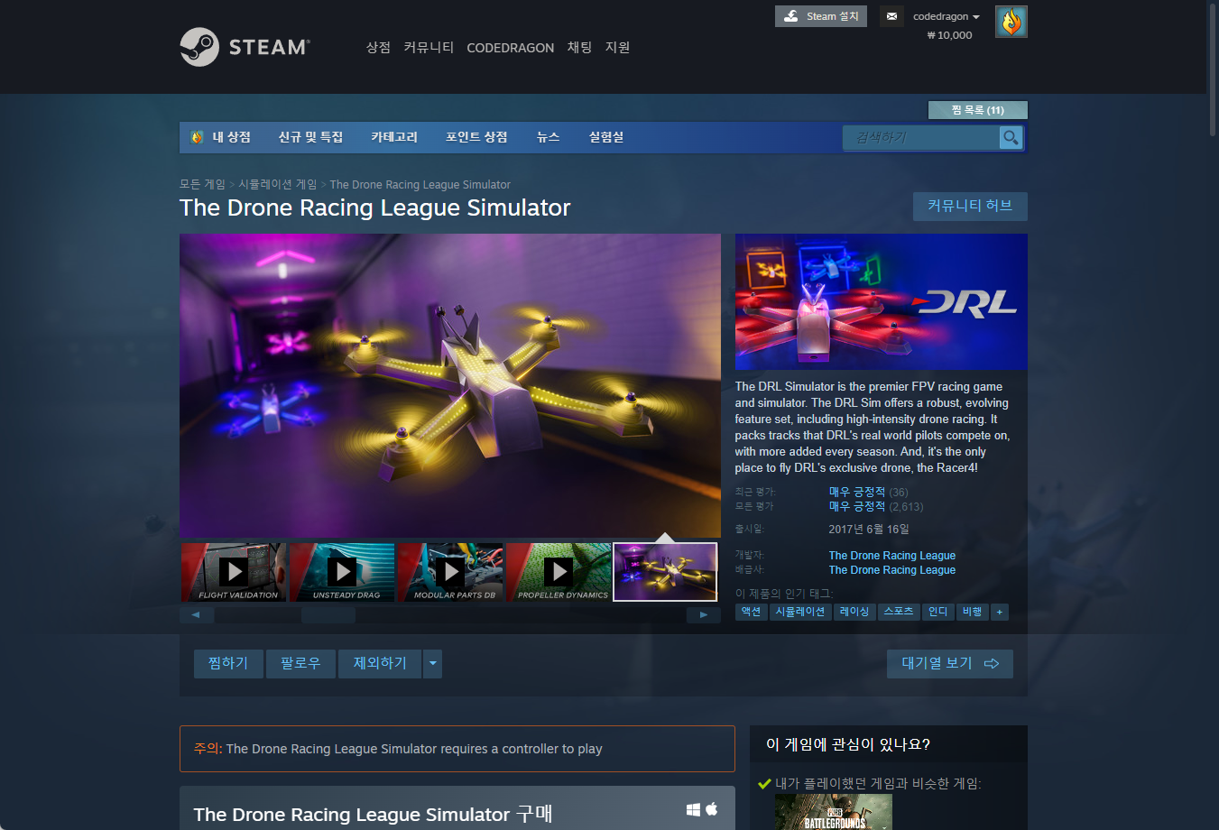 - "Drone Racing League Simulator" 게임 보유 확인