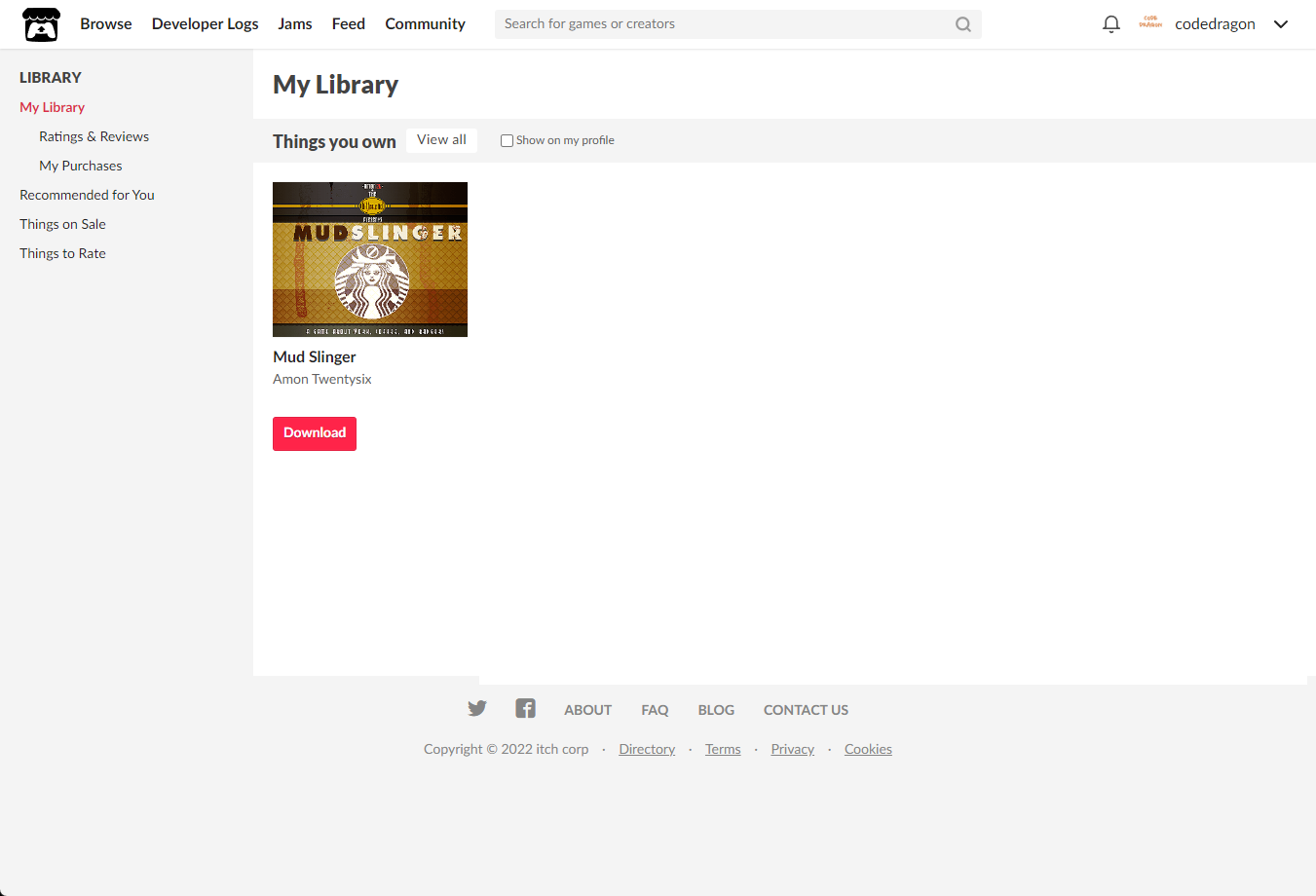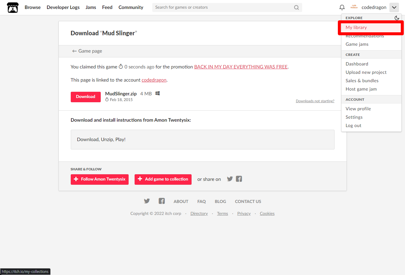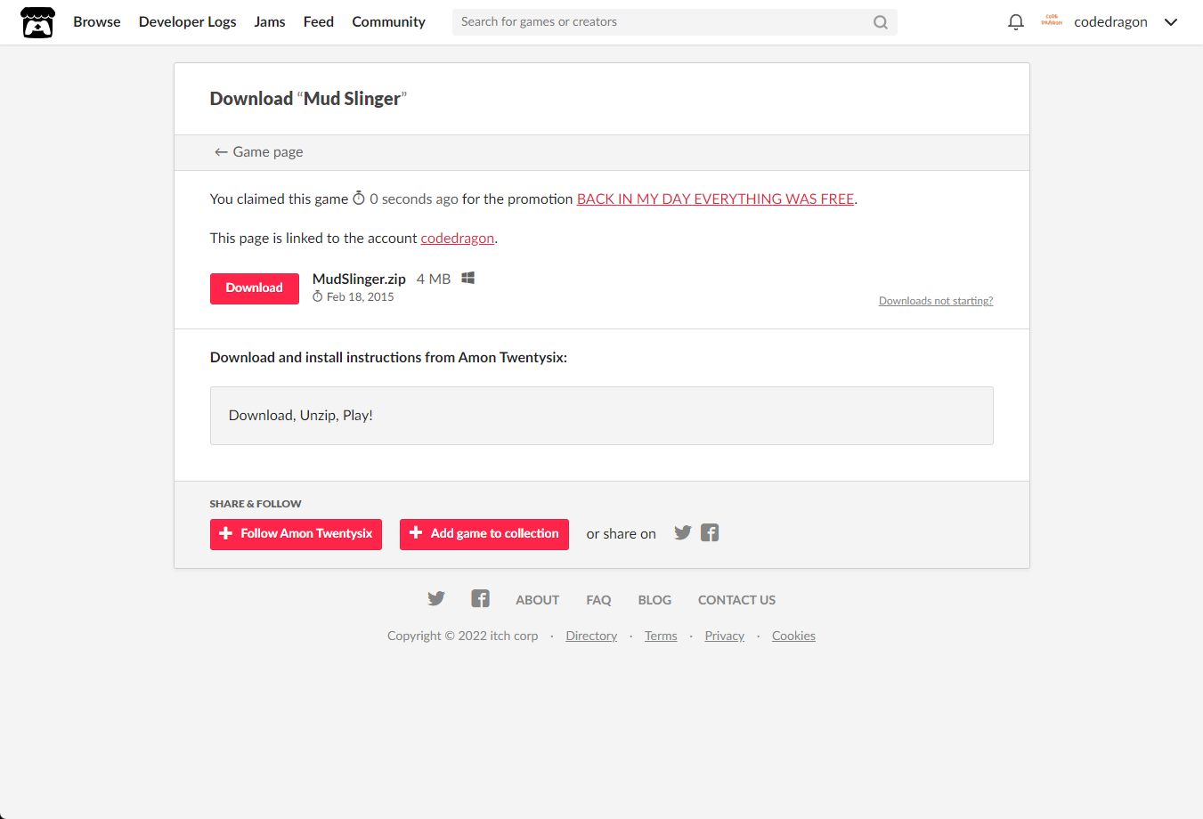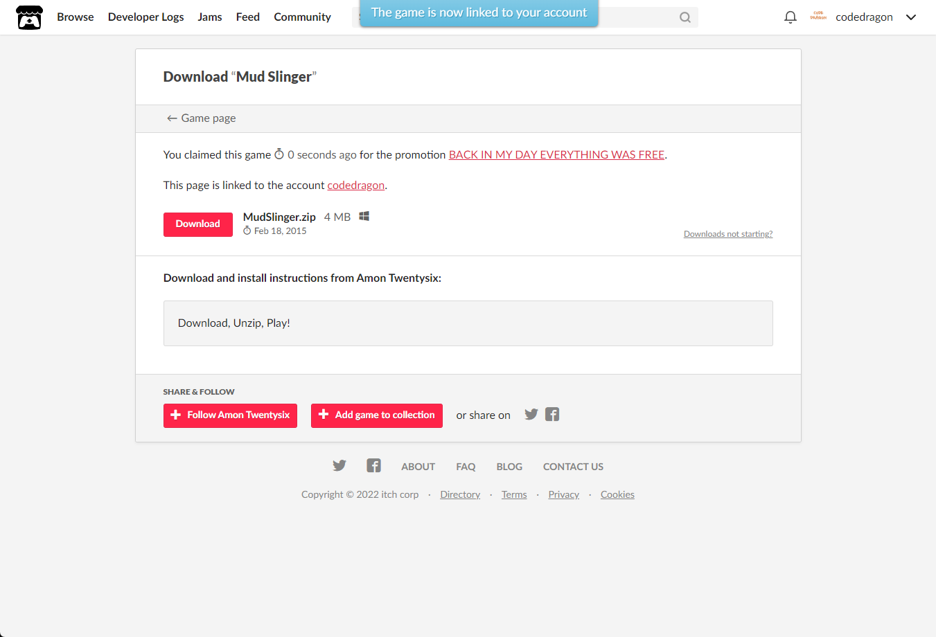 [Claim game]을 클릭하면 "Mud Slinger" 게임이 나의 게임 라이브러리에 추가되고 설치파일을 다운받을 수 있는 페이지로 이동됩니다.