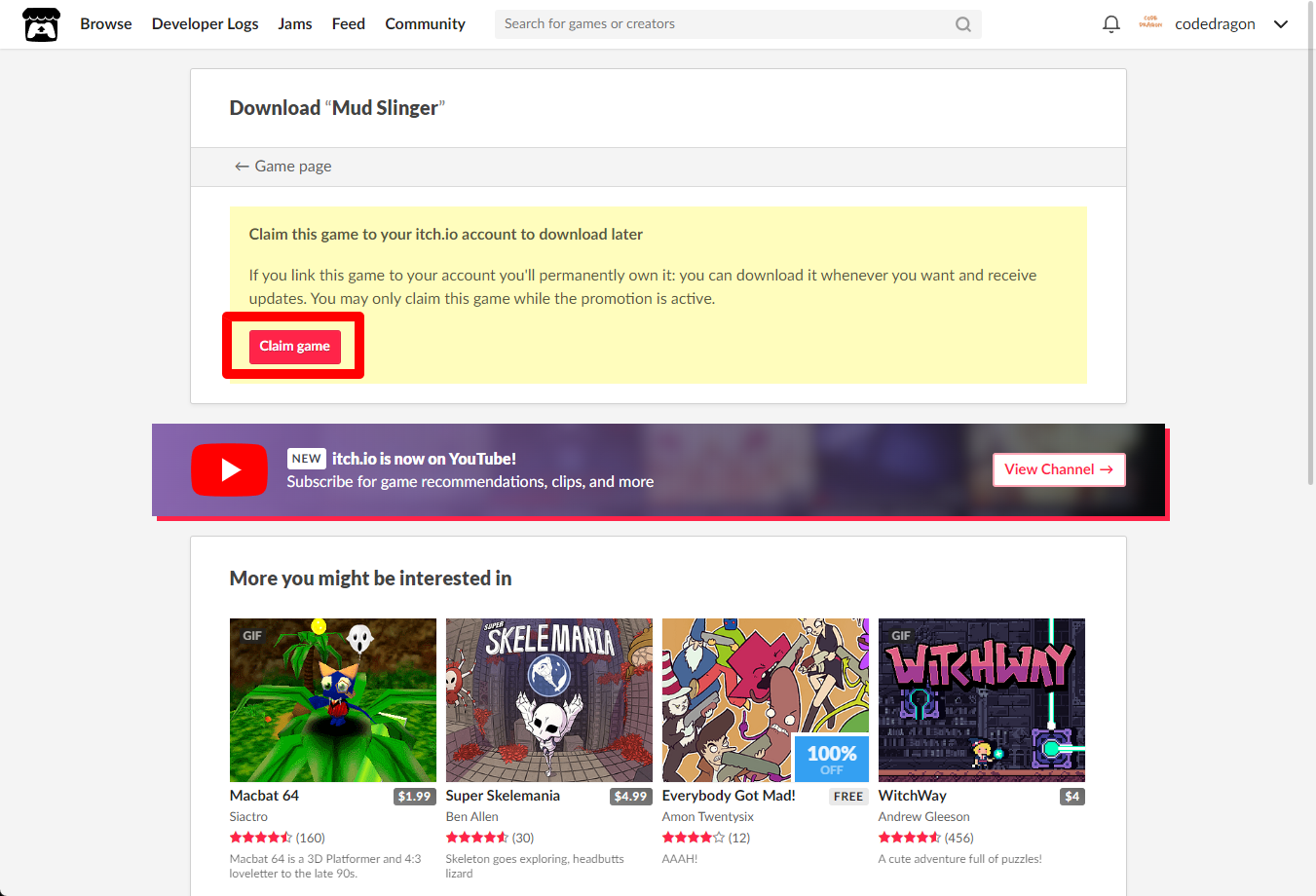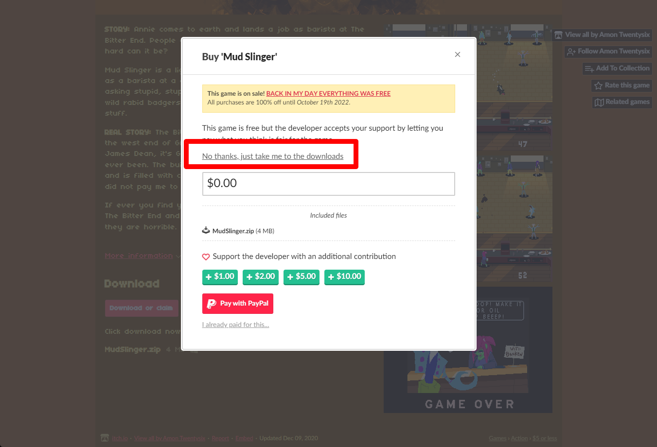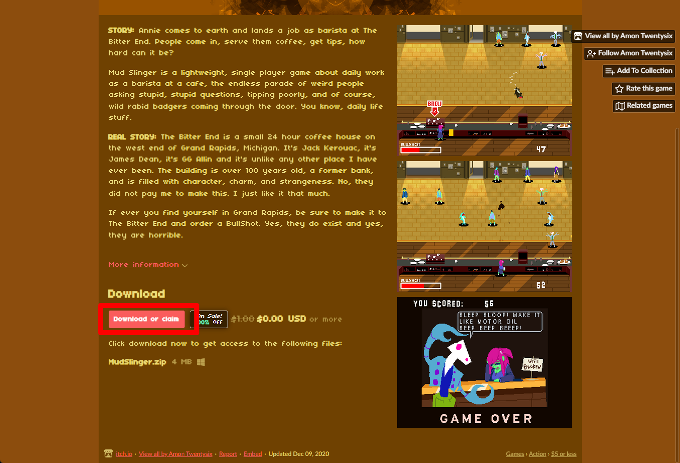 "Mud Slinger" 페이지를 내려서 [Download or claim]을 클릭합니다.