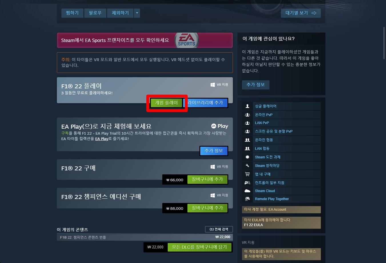 "F1® 22" 게임페이지를 조금 내려서 [게임 플레이] 버튼을 클릭하면 됩니다.
