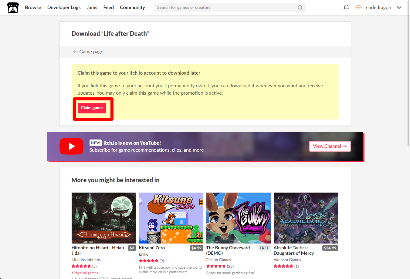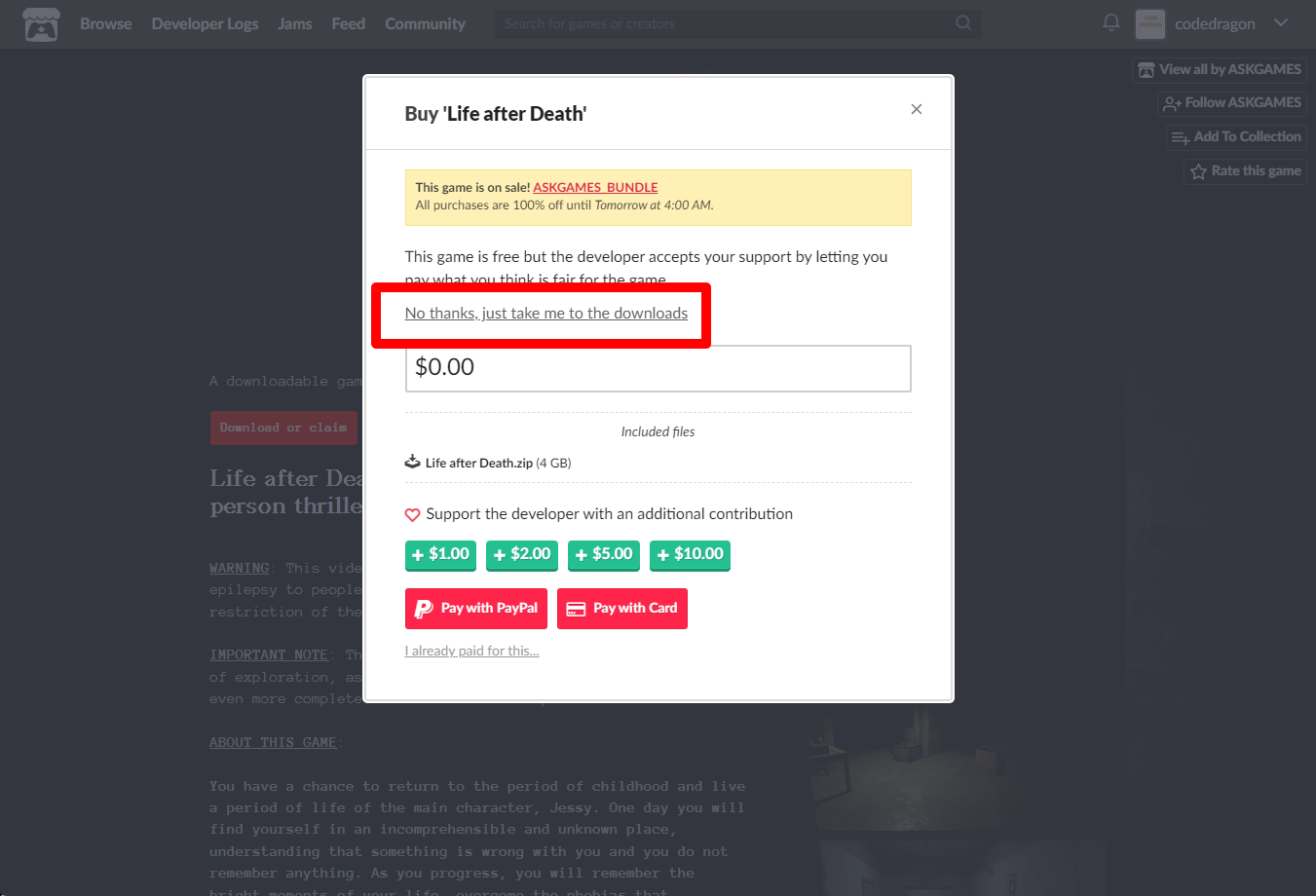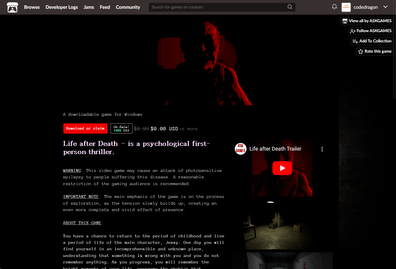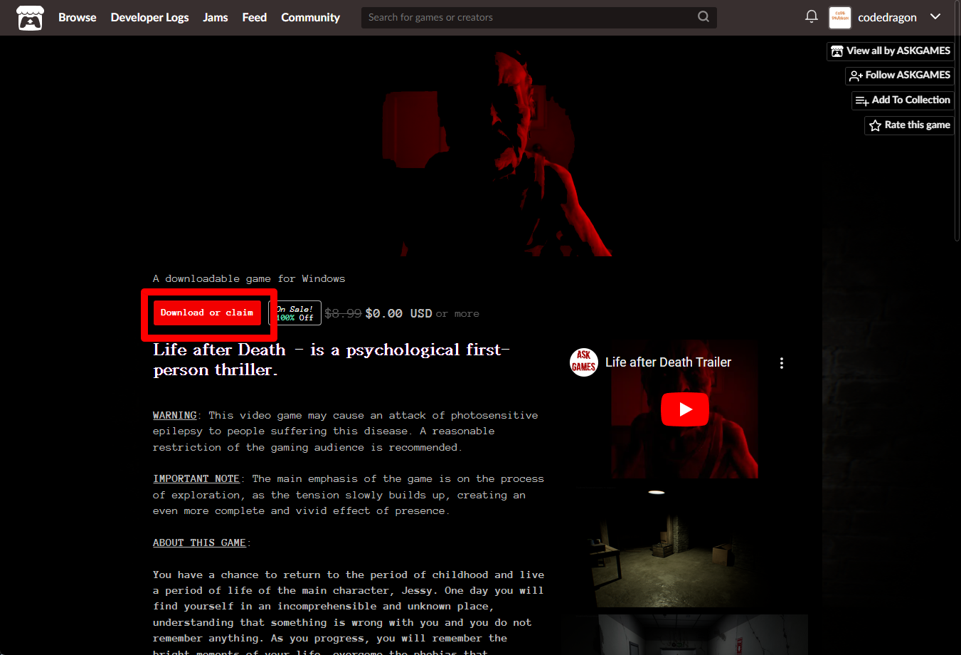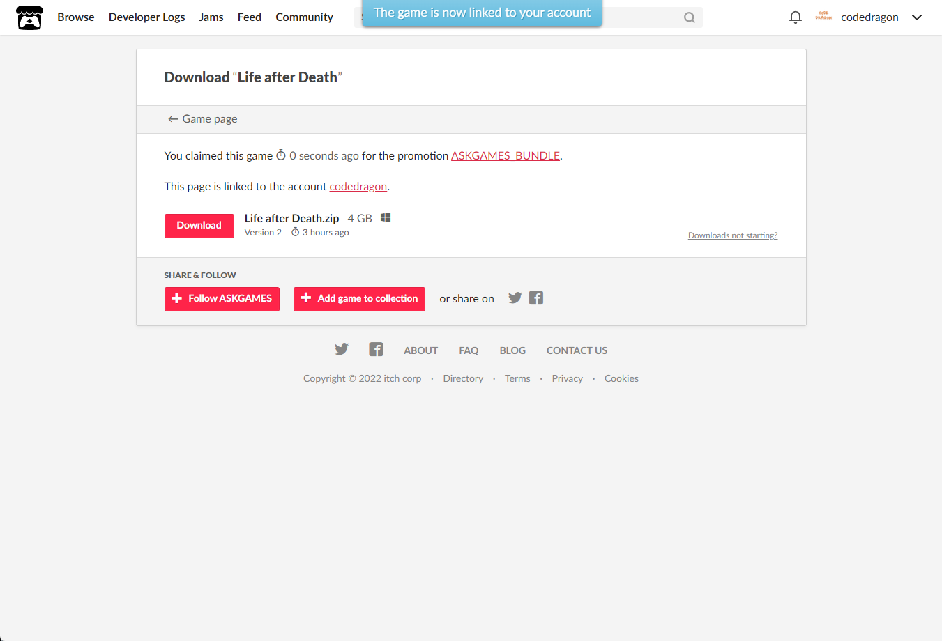 [Claim game]을 클릭하면 "Life after Death" 게임이 나의 게임 라이브러리에 추가되고 설치파일을 다운받을 수 있는 페이지로 이동됩니다.