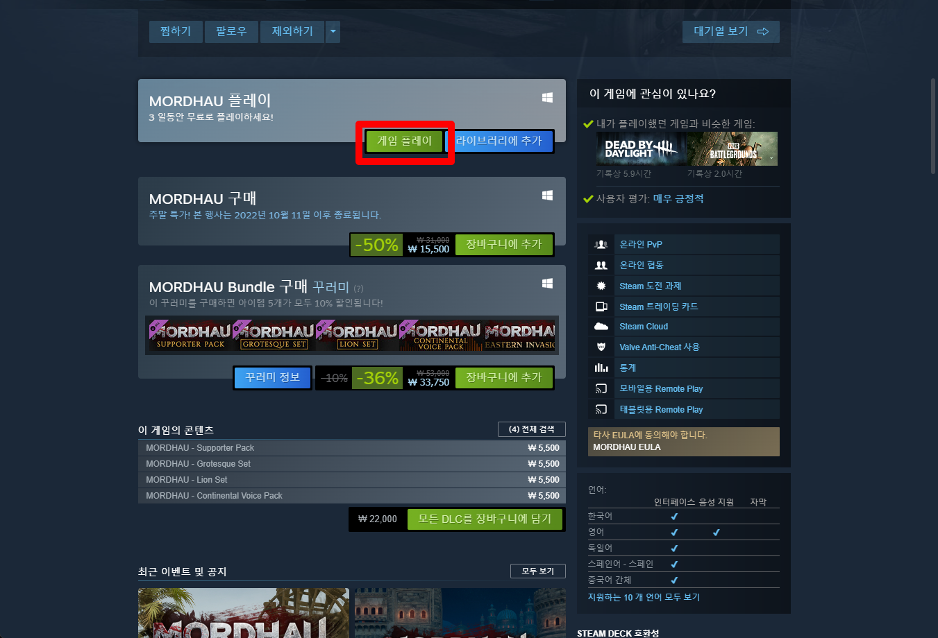 "MORDHAU" 게임페이지를 조금 내려서 [게임 플레이] 버튼을 클릭하면 됩니다.