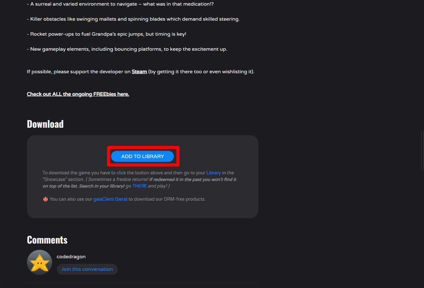 "RUN! GRANDPA! RUN!" 게임 페이지를 내려 [ADD TO LIBRARY]를 클릭합니다.