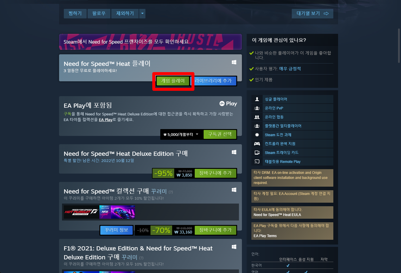 "Need for Speed™ Heat" 게임페이지를 조금 내려서 [게임 플레이] 버튼을 클릭하면 됩니다.
