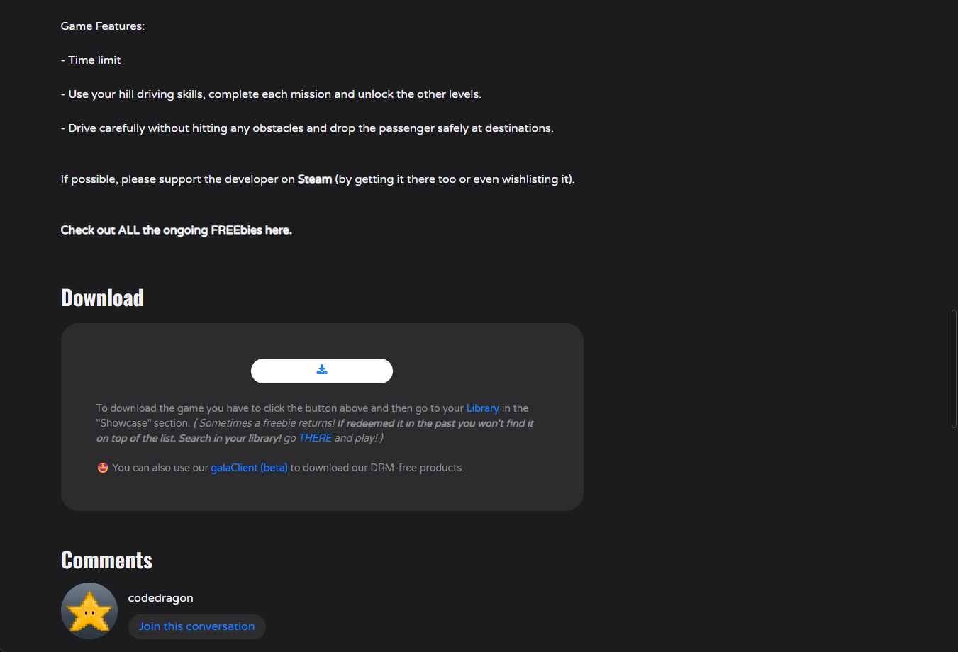 "Mountain Taxi Driver" 게임 페이지를 내려 [ADD TO LIBRARY]를 클릭합니다.