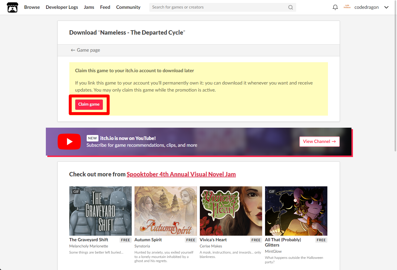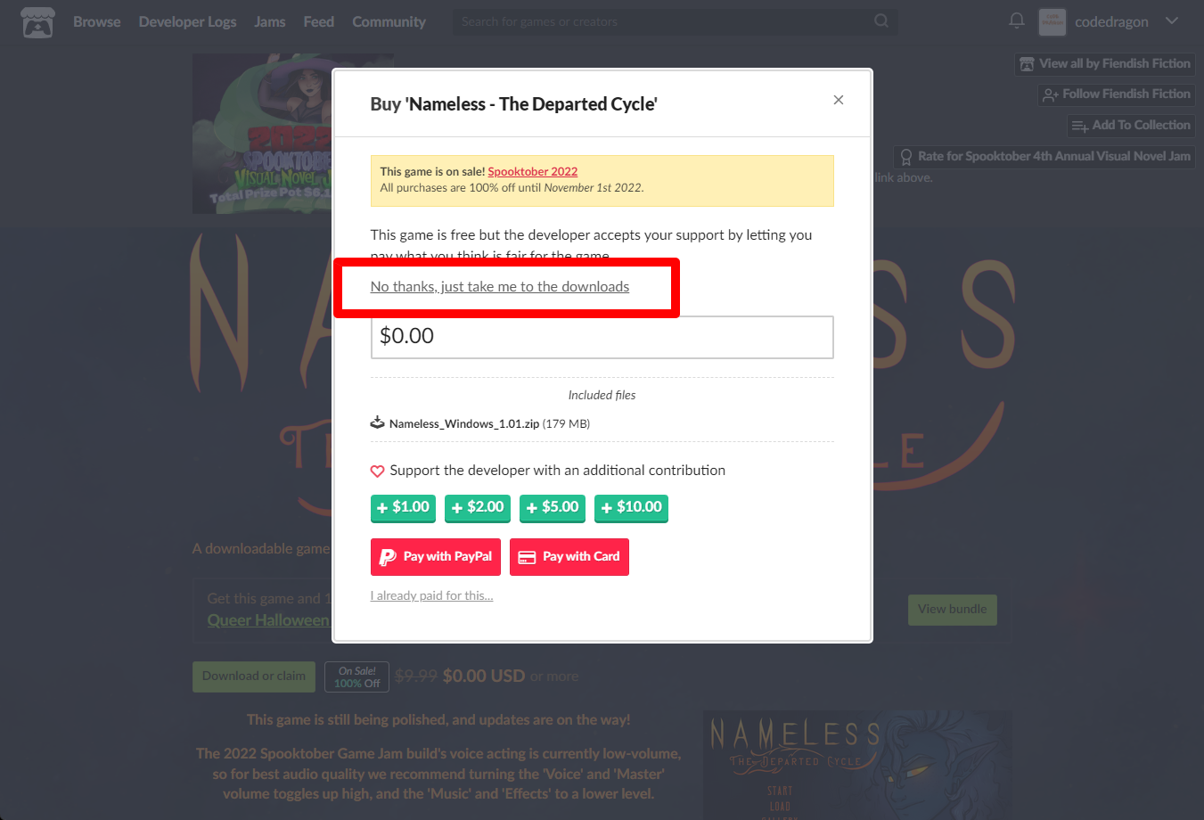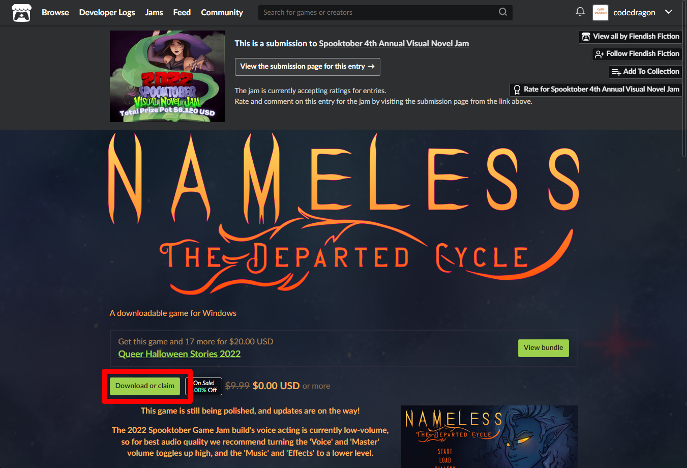 "Nameless - The Departed Cycle" 페이지에 있는 [Download or claim]을 클릭합니다.