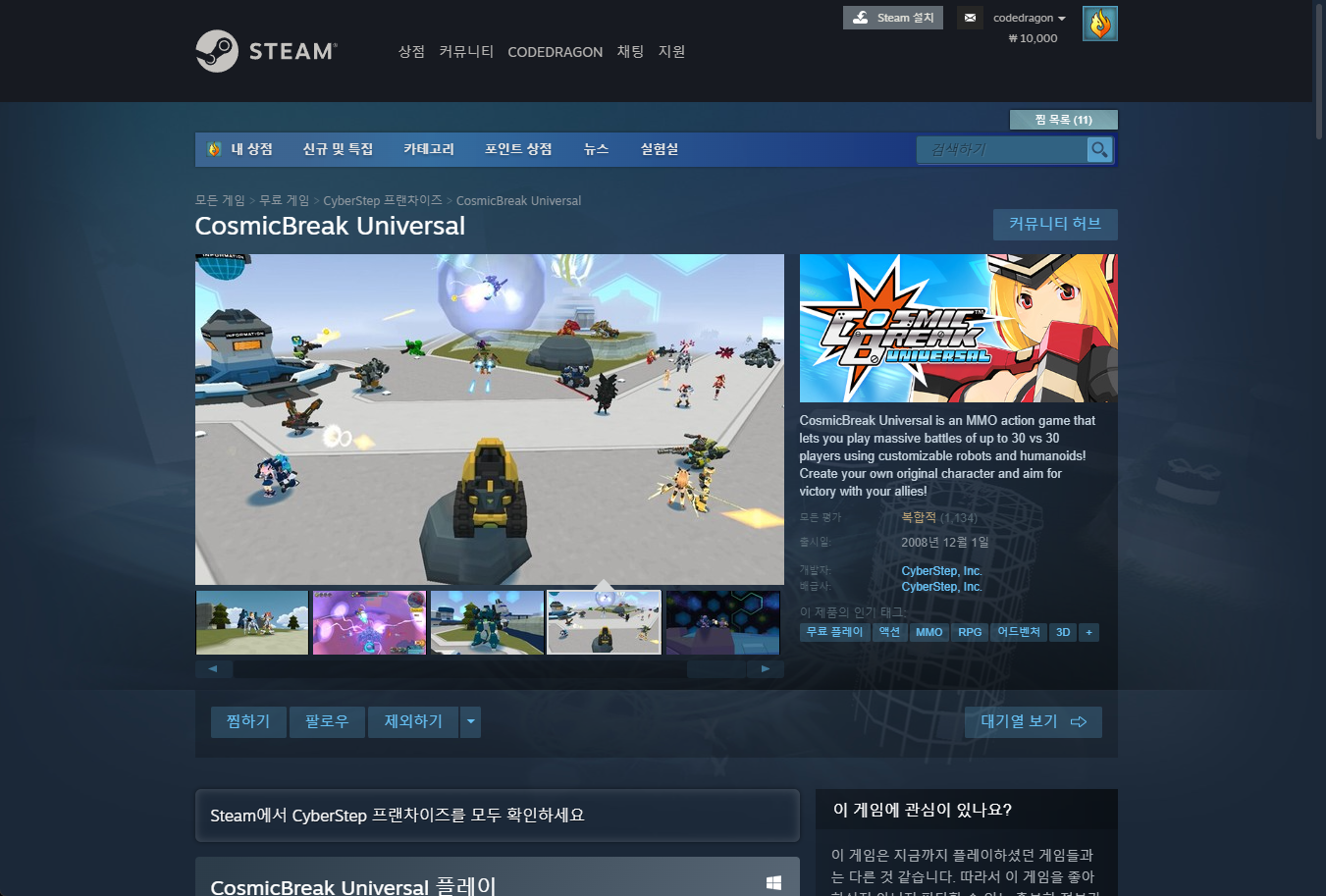"CosmicBreak Universal" 스팀 페이지 입니다.