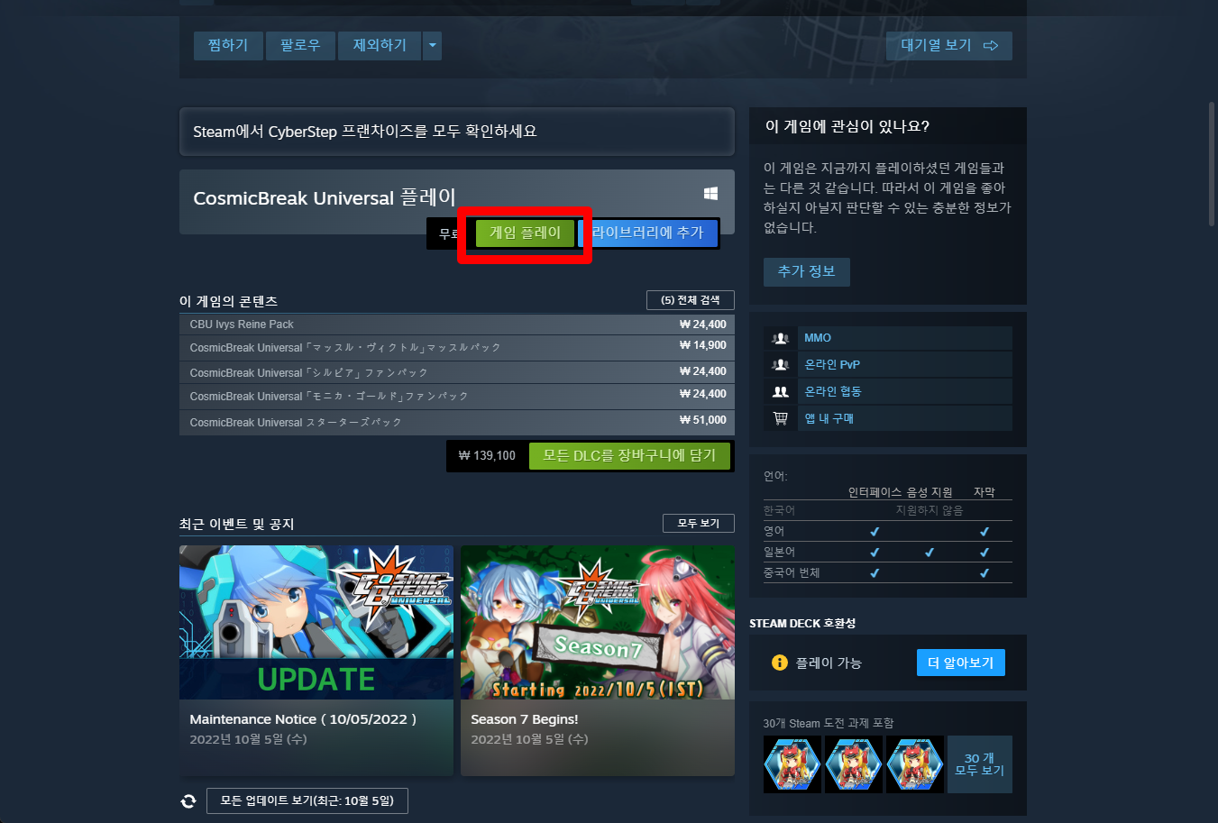 "CosmicBreak Universal" 페이지를 내려 [게임 플레이]를 클릭하면 됩니다.