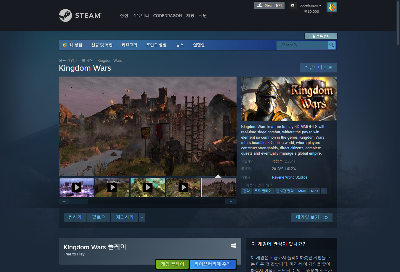 "Kingdom Wars" 스팀 페이지 입니다.