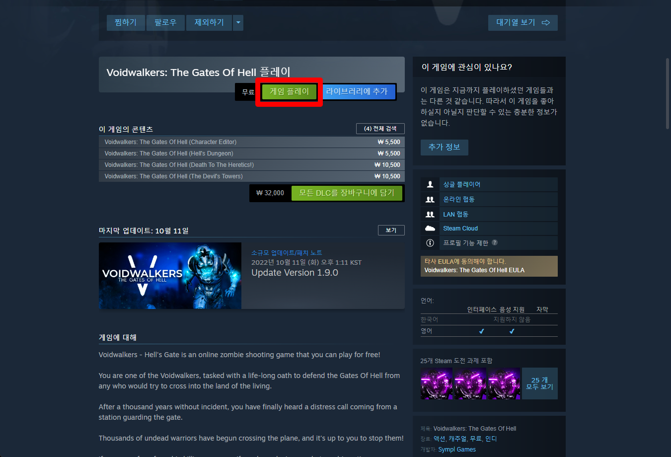 "Voidwalkers: The Gates Of Hell" 페이지를 내려 [게임 플레이]를 클릭하면 됩니다.