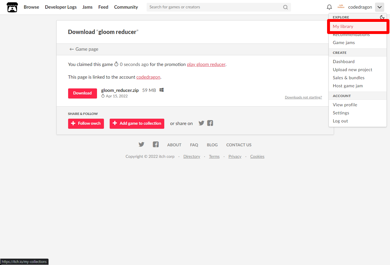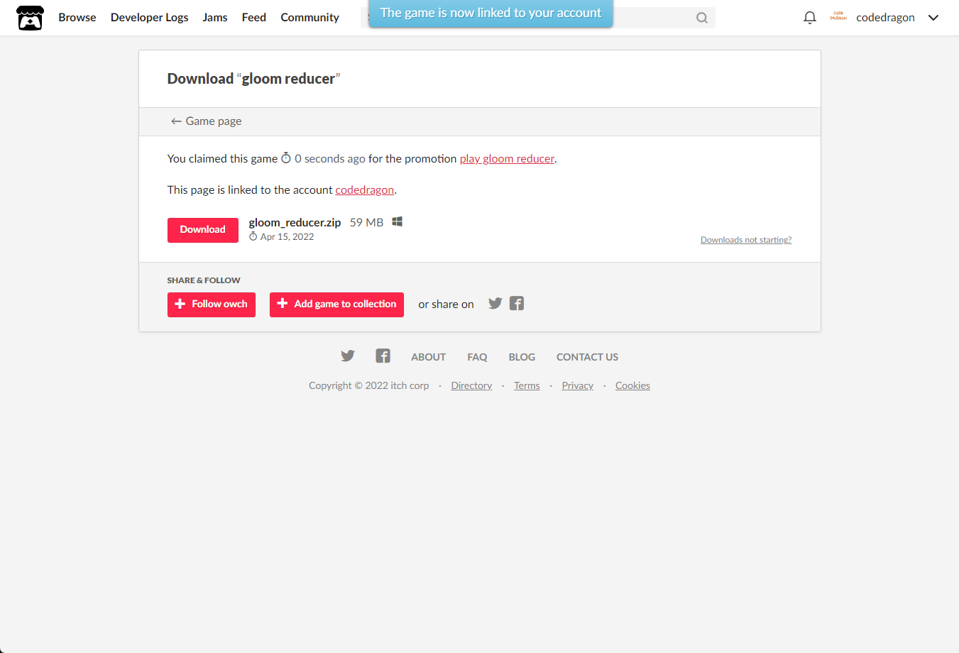 [Claim game]을 클릭하면 "gloom reducer" 게임이 나의 게임 라이브러리에 추가되고 설치파일을 다운받을 수 있는 페이지로 이동됩니다.