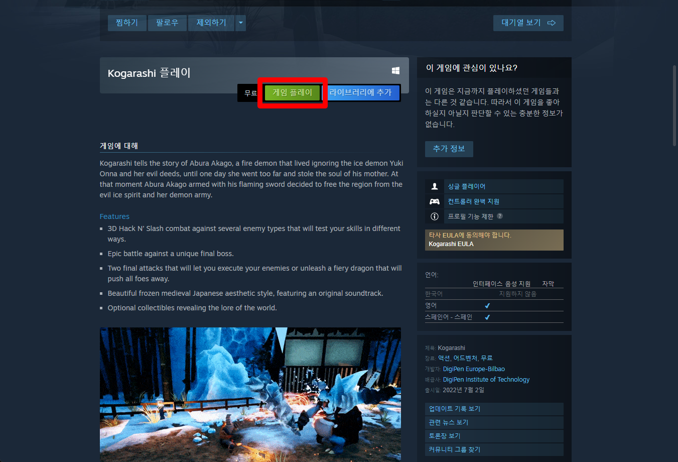 "Kogarashi" 페이지를 내려 [게임 플레이]를 클릭하면 됩니다.