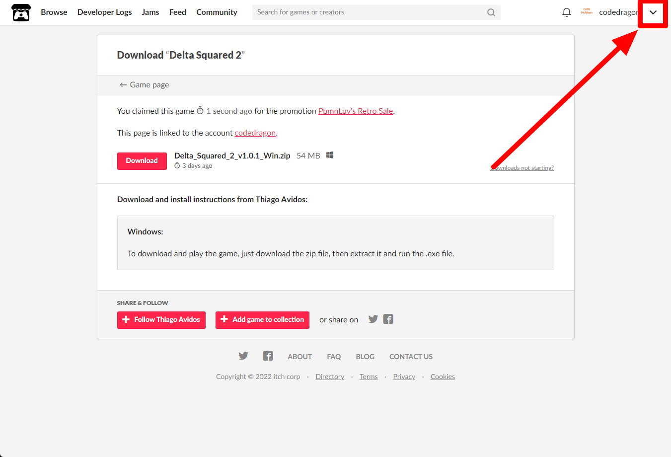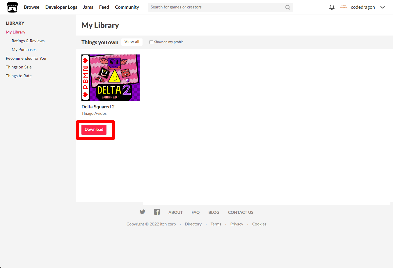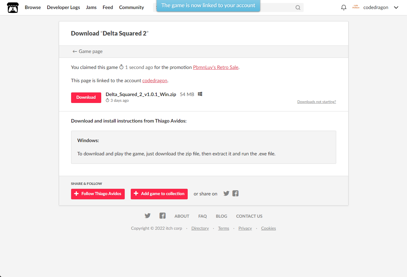 [Claim game]을 클릭하면 "Delta Squared 2" 게임이 나의 게임 라이브러리에 추가되고 설치파일을 다운받을 수 있는 페이지로 이동됩니다.