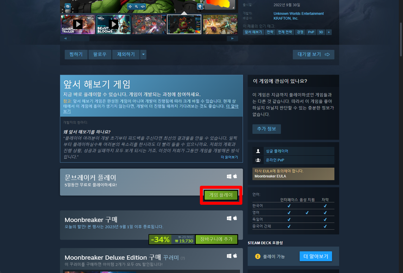 "Moonbreaker" 게임페이지를 조금 내려서 [게임 플레이] 버튼을 클릭하면 됩니다.