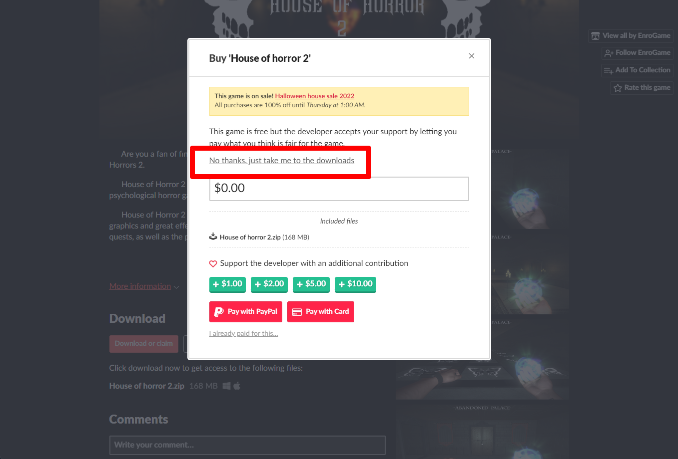 "House of horror 2" 구매창에서 [No thanks, just take me to the downloads] 링크를 클릭합니다.