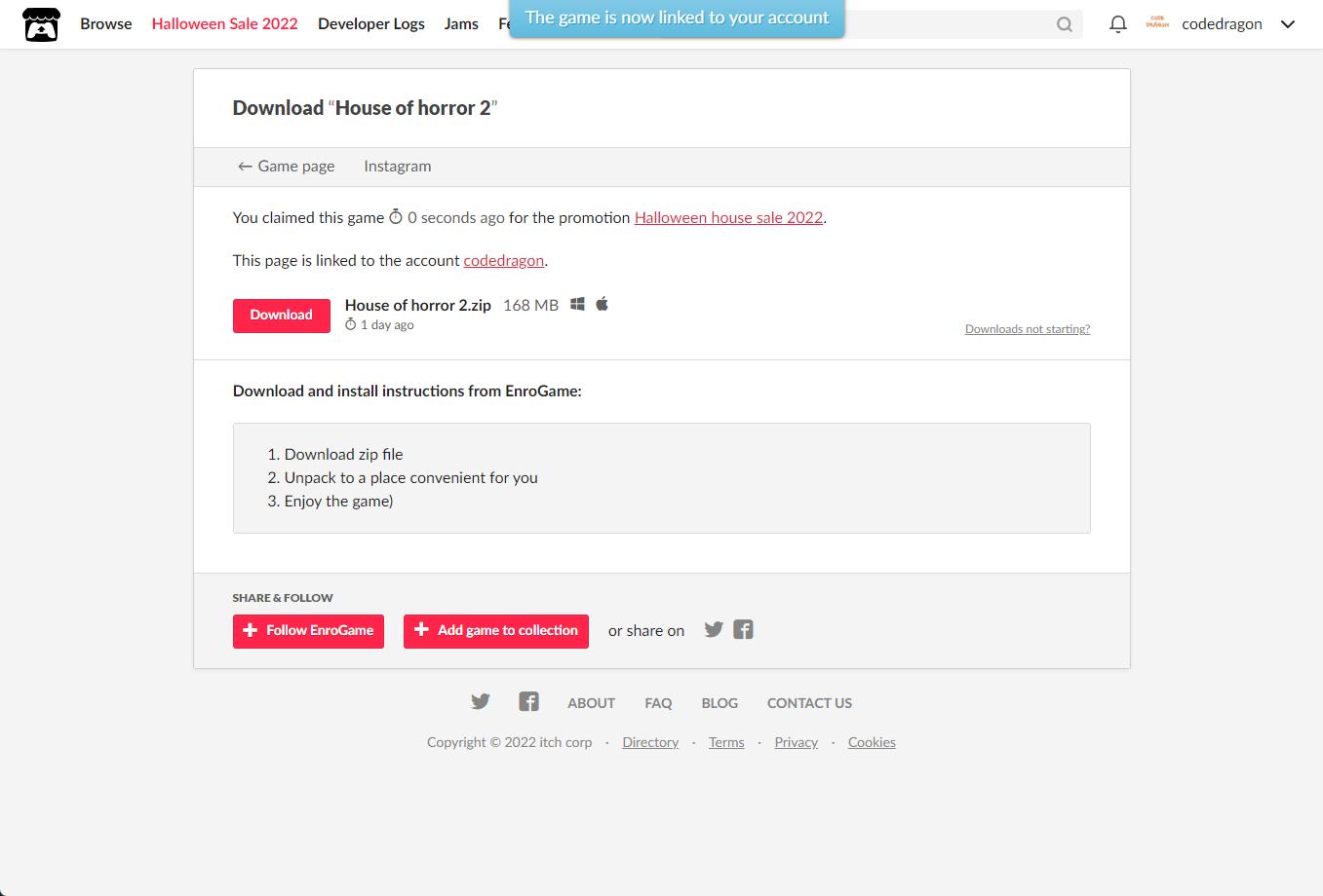 [Claim game]을 클릭하면 House of horror 2"" 게임이 나의 게임 라이브러리에 추가되고 설치파일을 다운받을 수 있는 페이지로 이동됩니다.