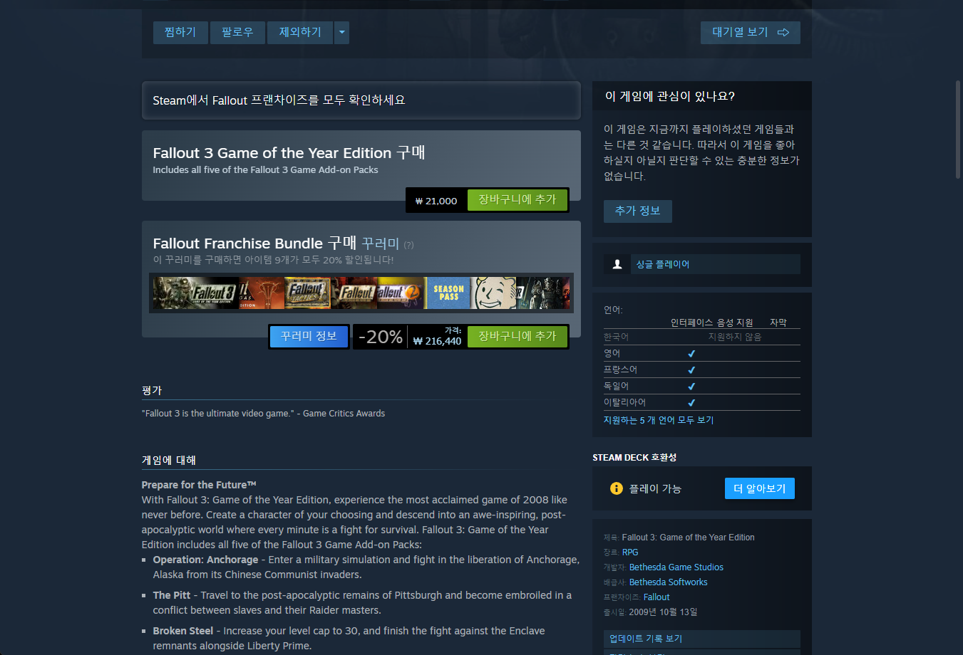 "Fallout 3: Game of the Year Edition" - Steam 스팀 게임 페이지