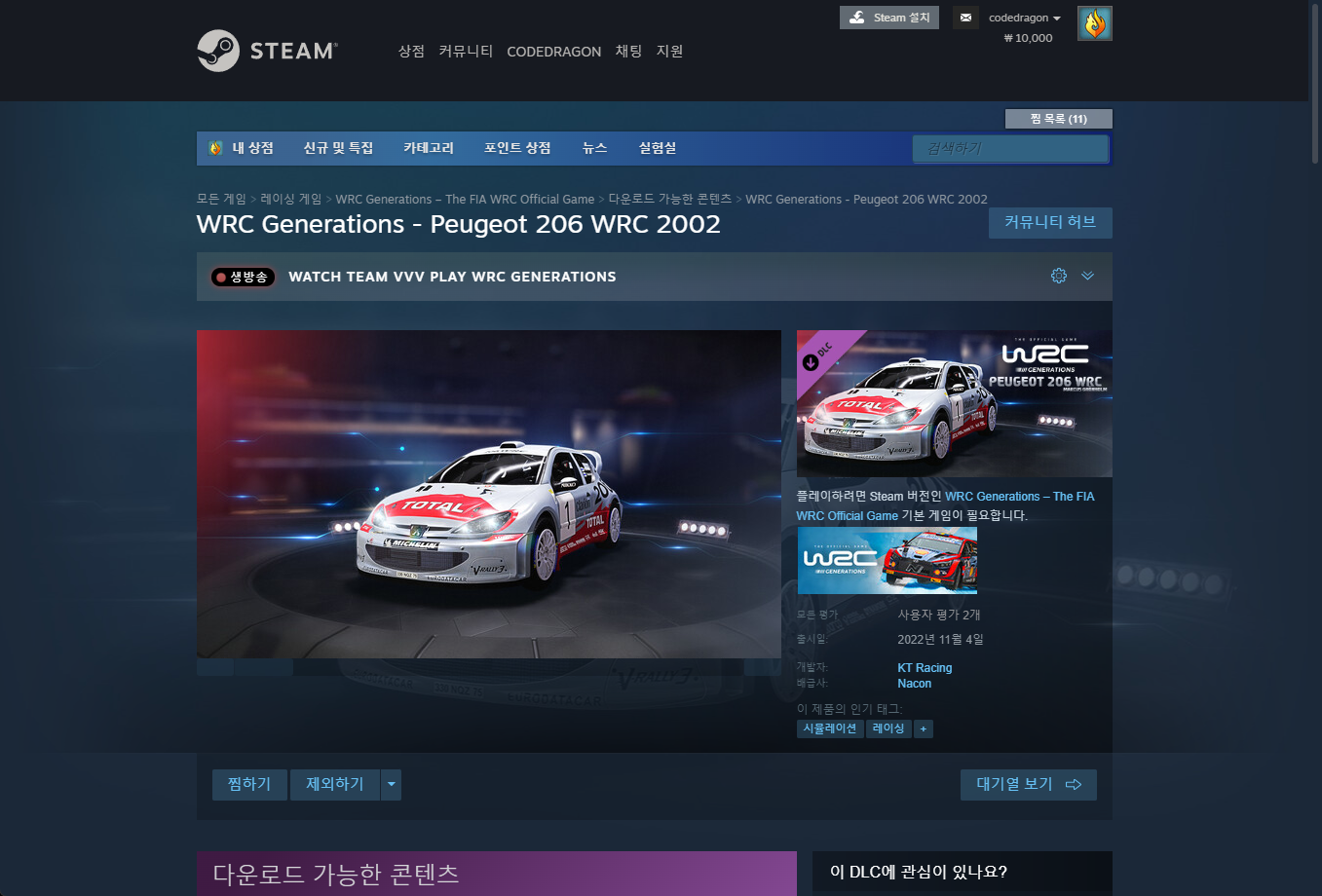 "WRC Generations - Peugeot 206 WRC 2002" DLC 게임페이지에 접속합니다.