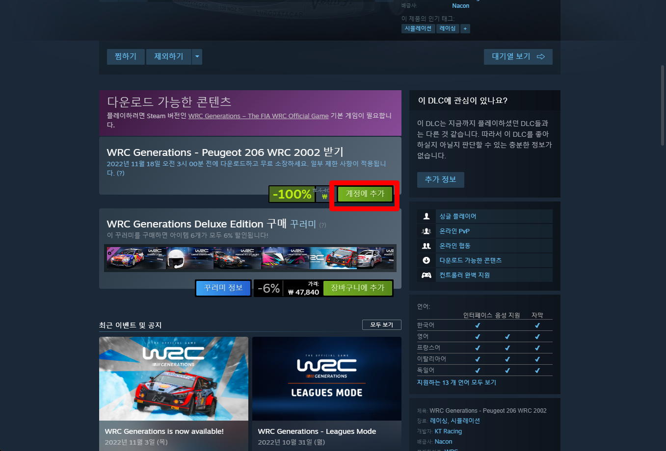 "WRC Generations - Peugeot 206 WRC 2002" 게임페이지를 조금 내려준 후 [계정에 추가] 버튼을 클릭하면 게임라이브러리에 추가됩니다.