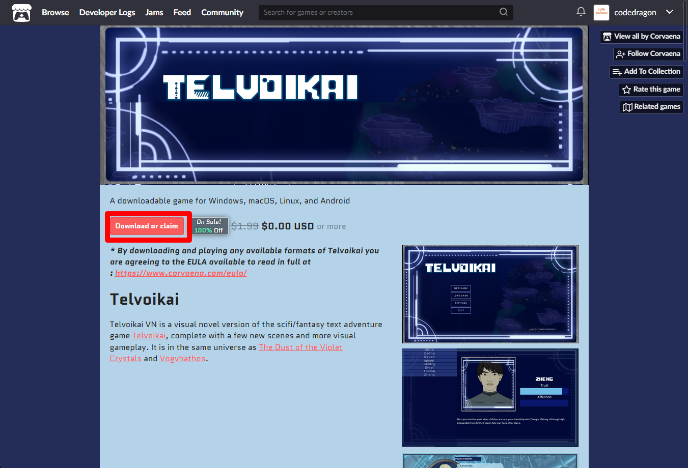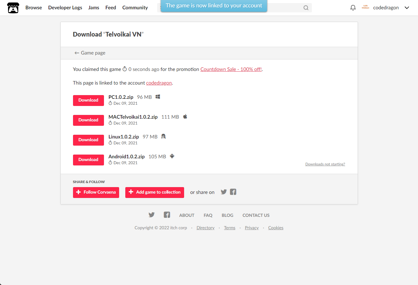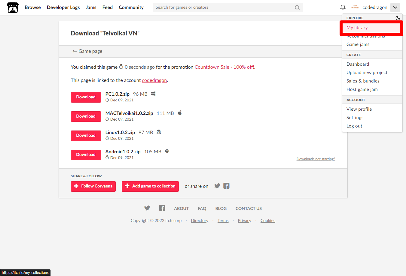 [Claim game]을 클릭하면 "Telvoikai VN" 게임이 나의 게임 라이브러리에 추가되고 설치파일을 다운받을 수 있는 페이지로 이동됩니다.