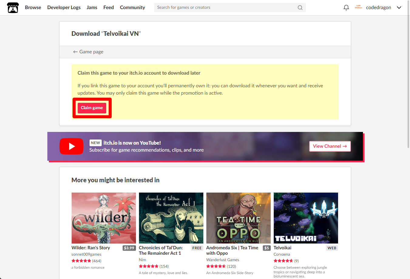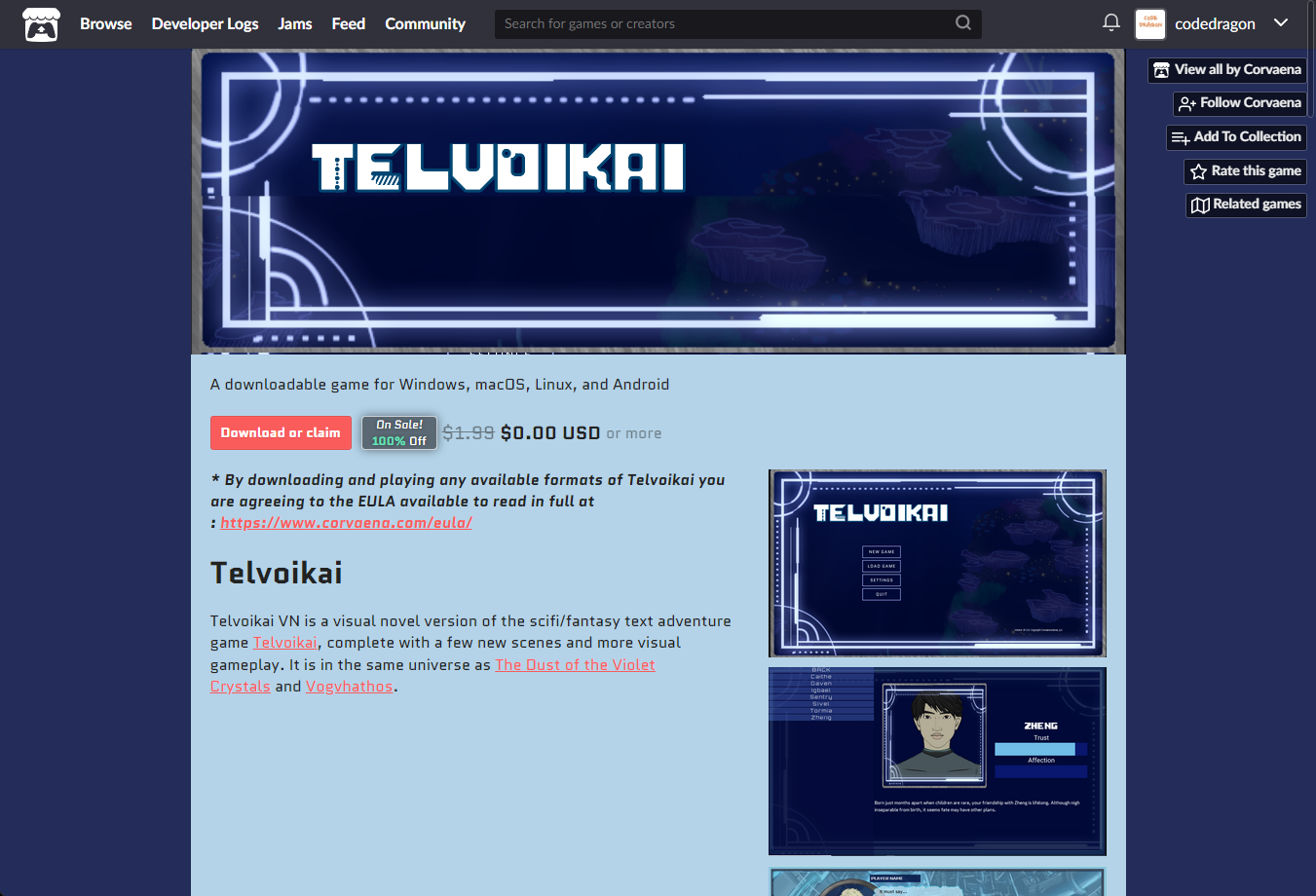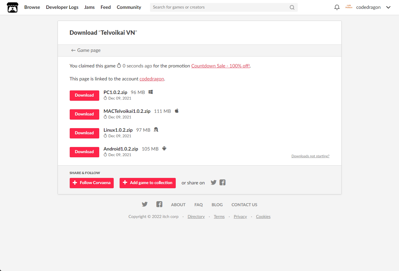 [Claim game]을 클릭하면 "Telvoikai VN" 게임이 나의 게임 라이브러리에 추가되고 설치파일을 다운받을 수 있는 페이지로 이동됩니다.