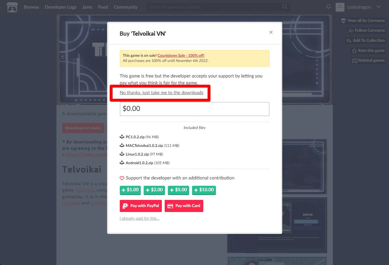 "Telvoikai VN" 구매창에서 [No thanks, just take me to the downloads] 링크를 클릭합니다.