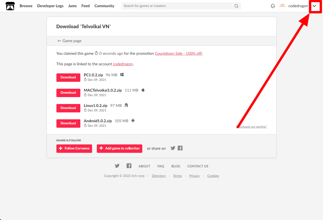 itch.io에서 받은 "Telvoikai VN" 게임 확인하고 설치파일 다운받아 보겠습니다. 우측 상단의 나의 사용자명 오른쪽의 화살표 아이콘을 클릭합니다.