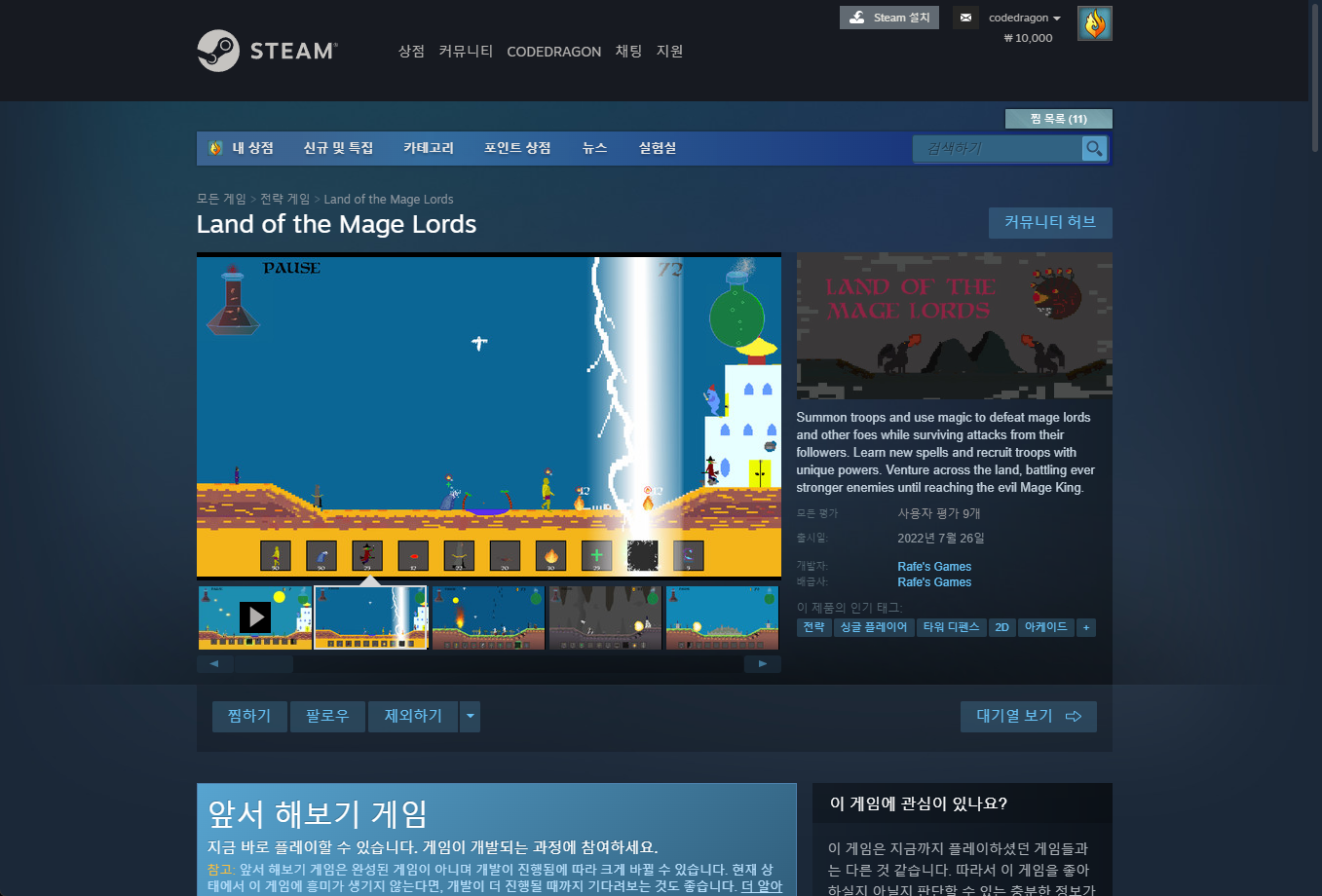 "Land of the Mage Lords" 스팀 페이지 입니다.