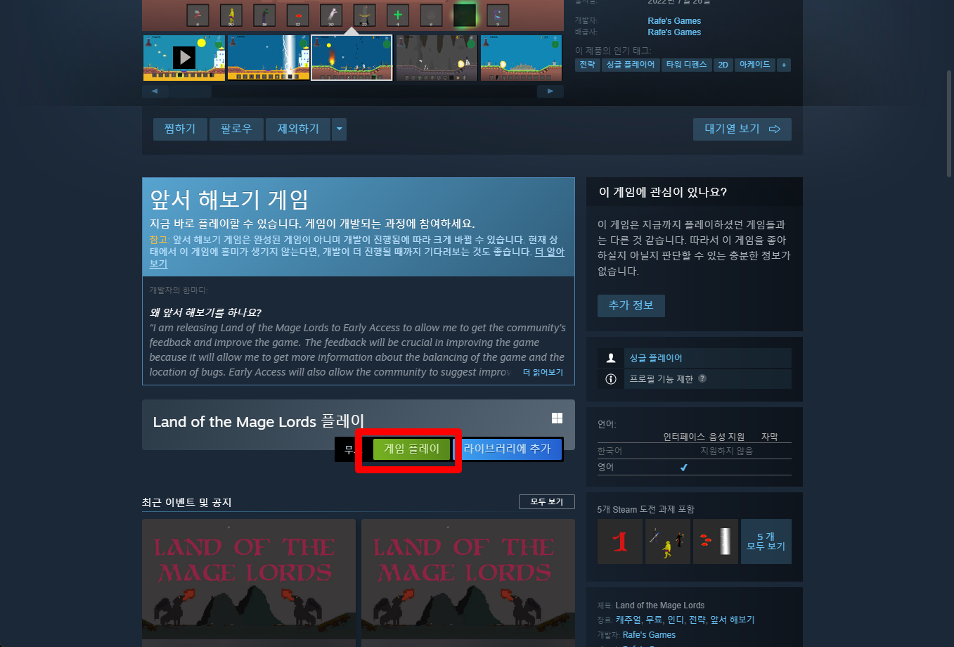 "Land of the Mage Lords" 페이지를 내려 [게임 플레이]를 클릭하면 됩니다.
