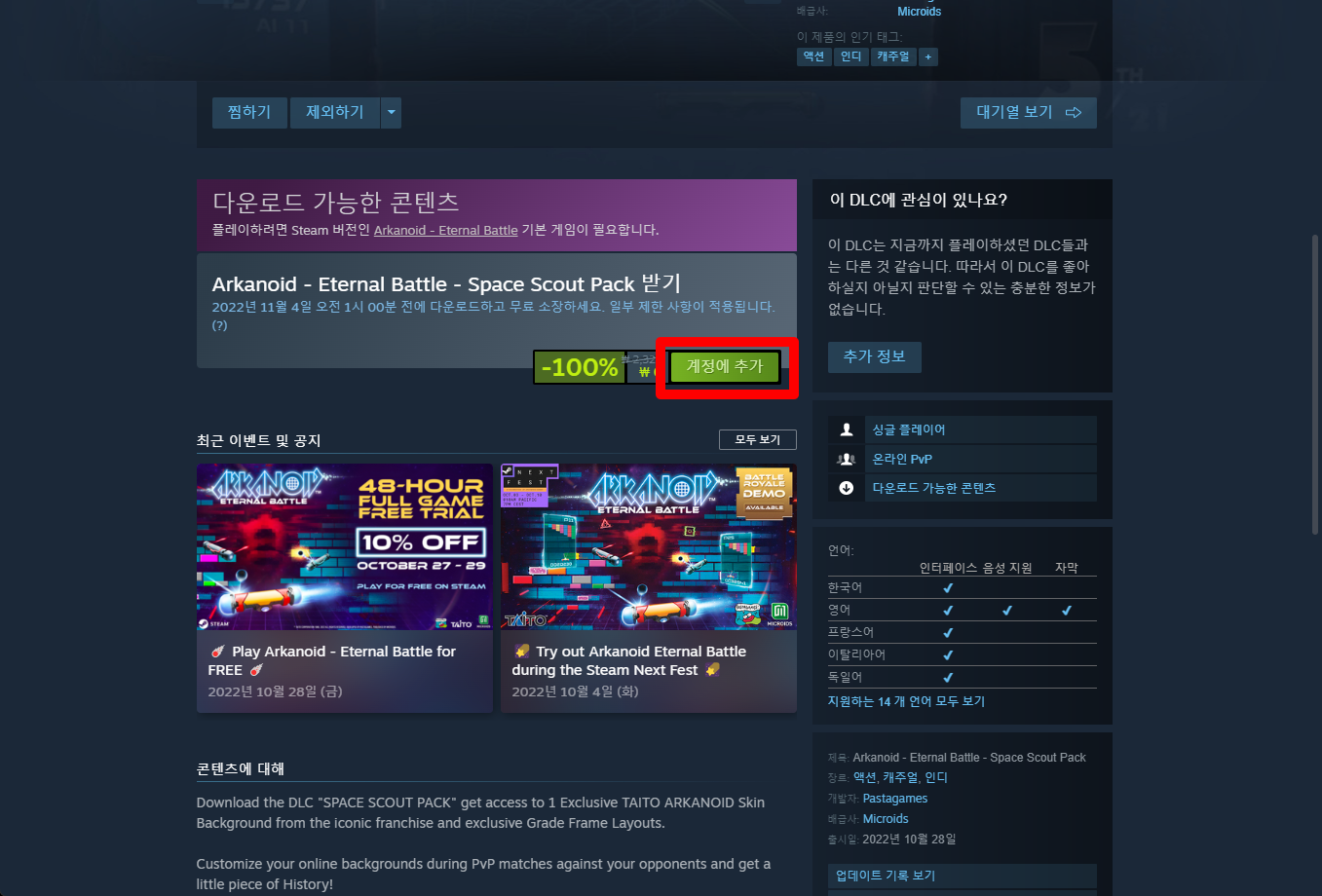"Arkanoid - Eternal Battle - Space Scout Pack" 게임페이지를 조금 내려준 후 [계정에 추가] 버튼을 클릭하면 게임라이브러리에 추가됩니다.