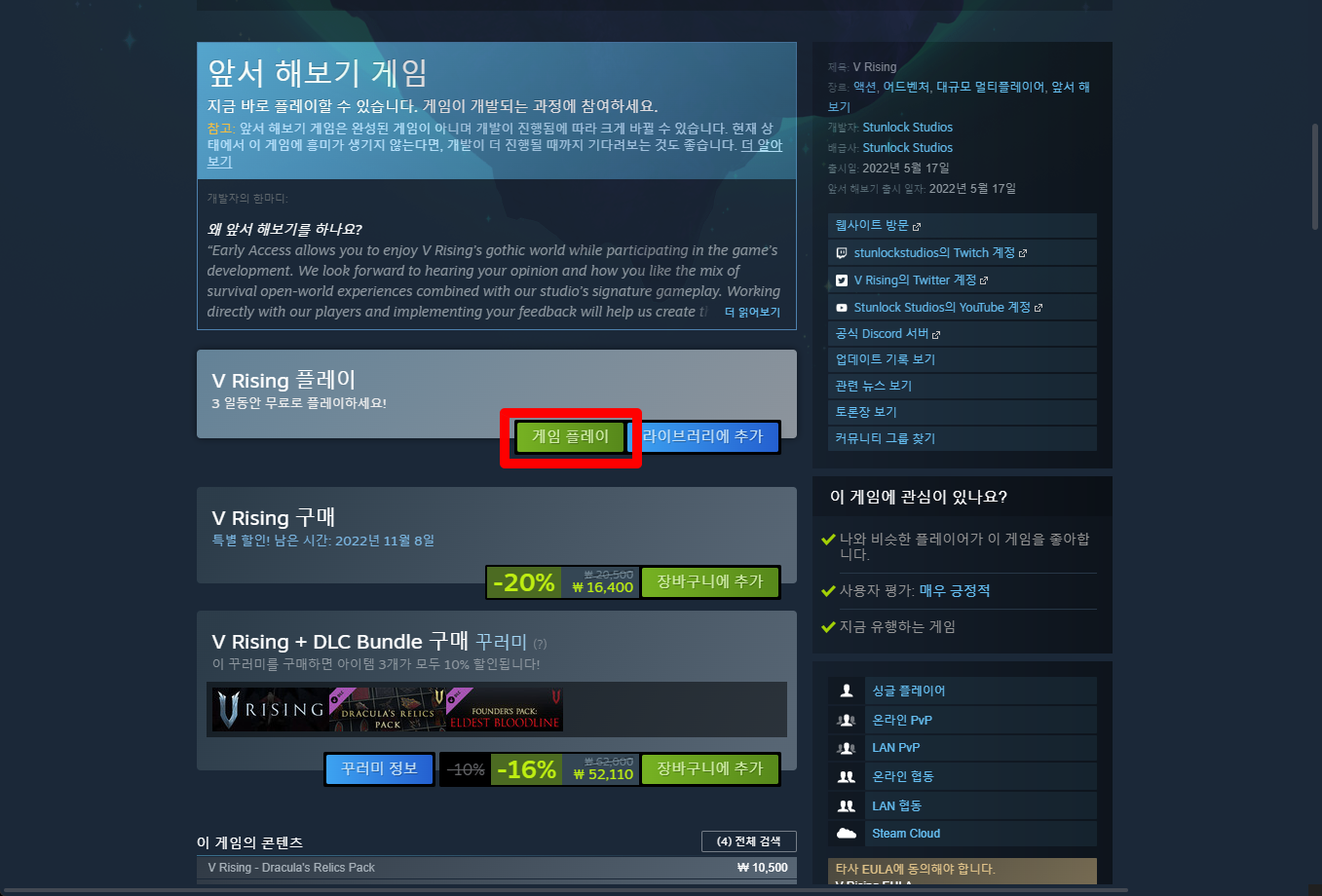 "V Rising" 게임페이지를 조금 내려서 [게임 플레이] 버튼을 클릭하면 됩니다.