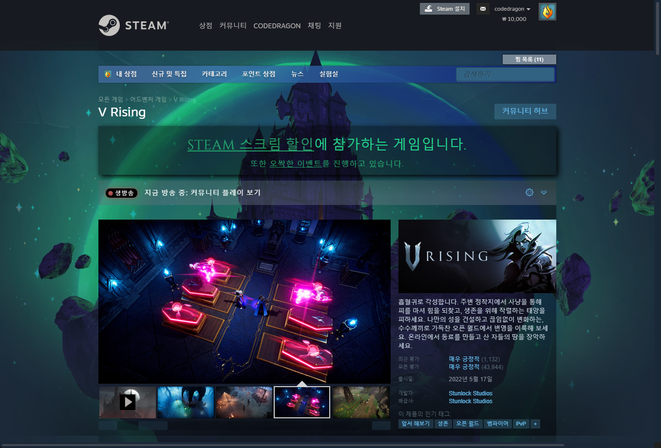 "V Rising" 게임페이지에 접속합니다.